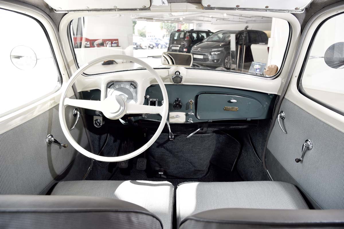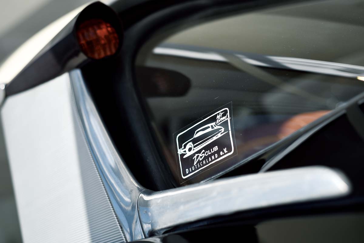 後擋玻璃上的俱樂部貼紙,透露了此車曾造訪德國的身世,而車艙內裝完善的保存狀態,也讓人體會前車主對它的悉心呵護。沿著充滿50年代意趣的車門板往上瞧,我注意到了此車的無邊框車窗,這在當時相當少見,特別是對一部房車而言。不過,更少見的是那後來成為Citroen諸多經典車款特色的單幅式方向盤,而且它還具有自創的液壓動力輔助。位於方向盤後方的排檔桿是當時的流行,不過與之搭配的半自動變速箱,其不需離合器即可換檔的高液壓系統,卻是當時的劃時代發明。