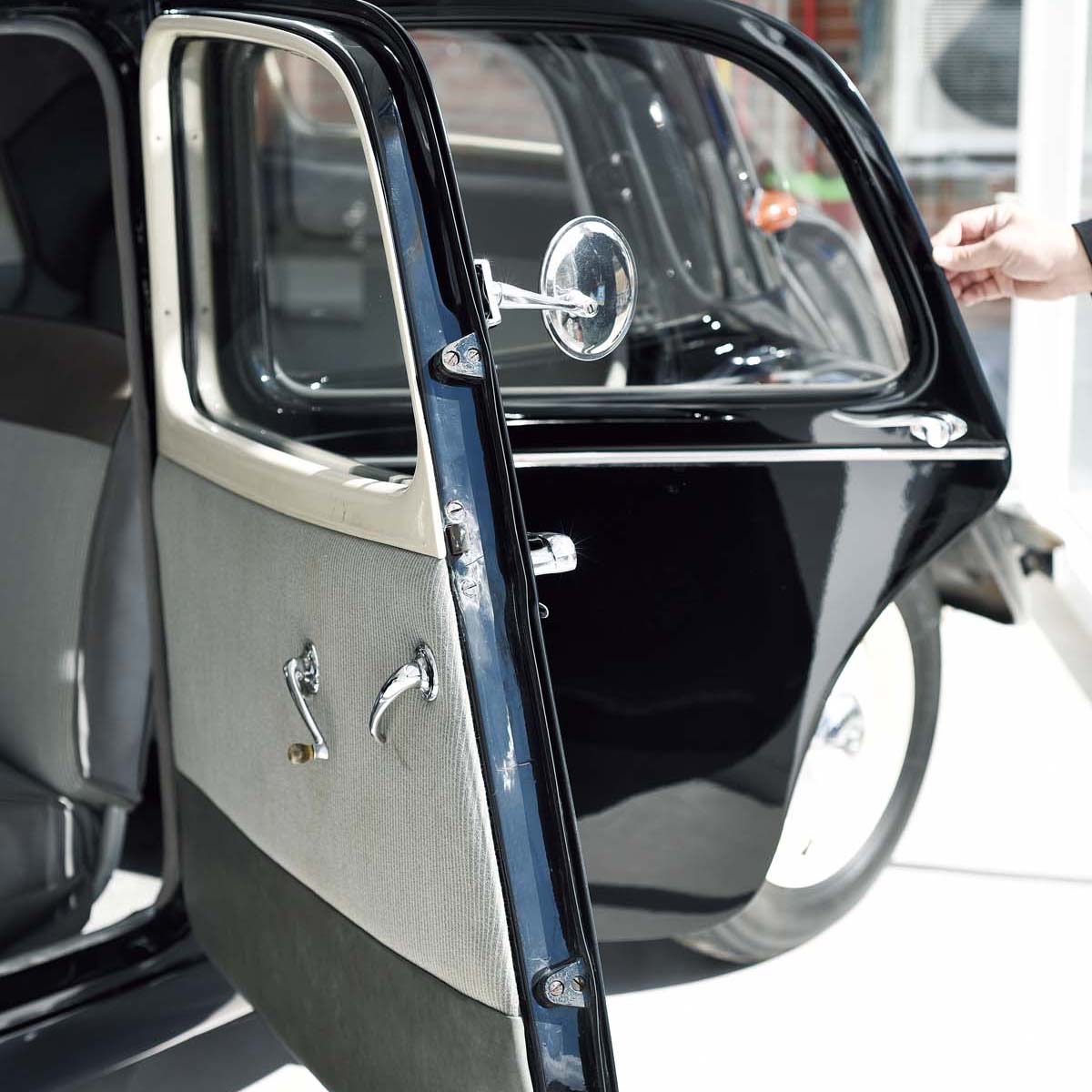 大膽而協調,是詮釋Traction Avant設計的最佳形容,你可以從造型獨特卻不突兀的電鍍前保桿,以及狀似蝸牛、與車側門檻形成柔和弧線的前、後輪拱,感受到這份膽大心細。再仔細看,輪拱近車門端還整合了供乘員去除塵土的踏板,而它們的位置又恰好符合前、後車門以B柱為軸心的特殊背向對開方式,真的是巧妙至極!公關提醒我們:「包括它的輪胎規格,還有小如加油孔蓋、尾燈等零件,現在可是只能訂製的逸品。」於是,我們小心翼翼地觸碰每個部份,以免損傷這部法國國寶。