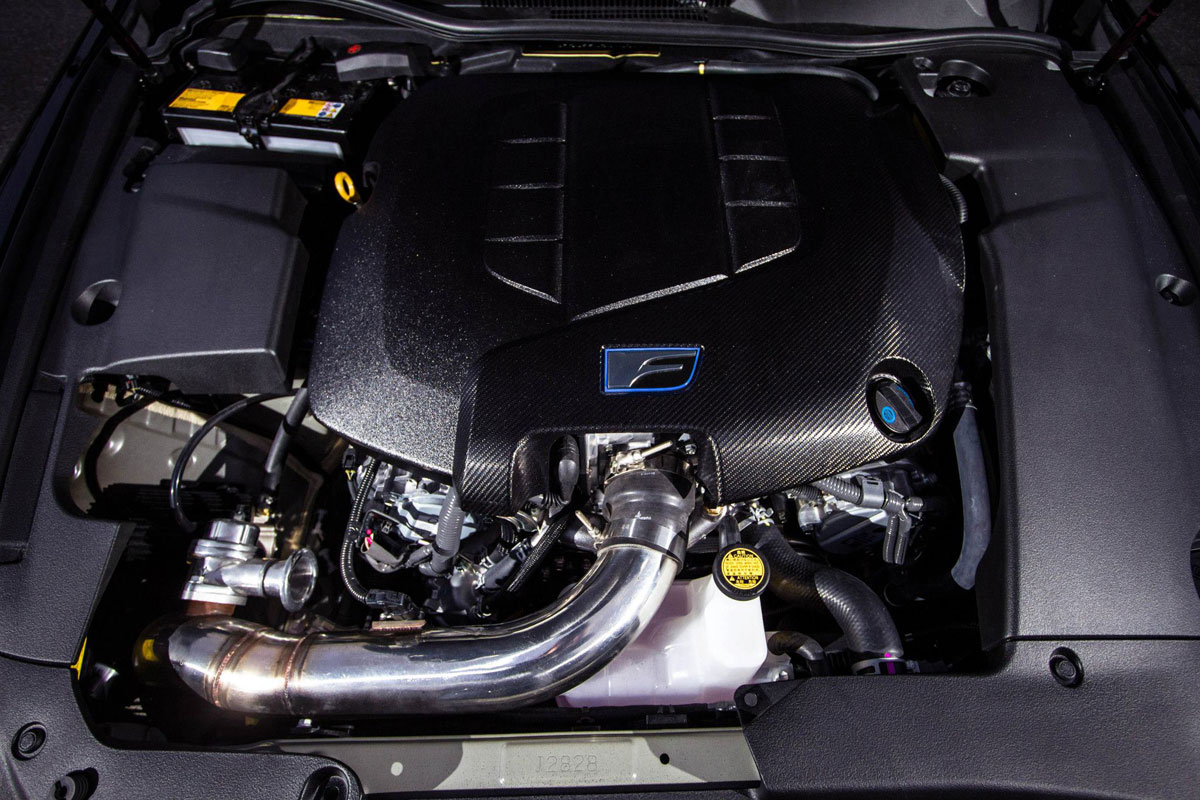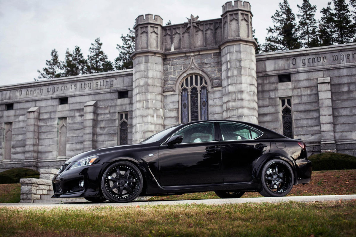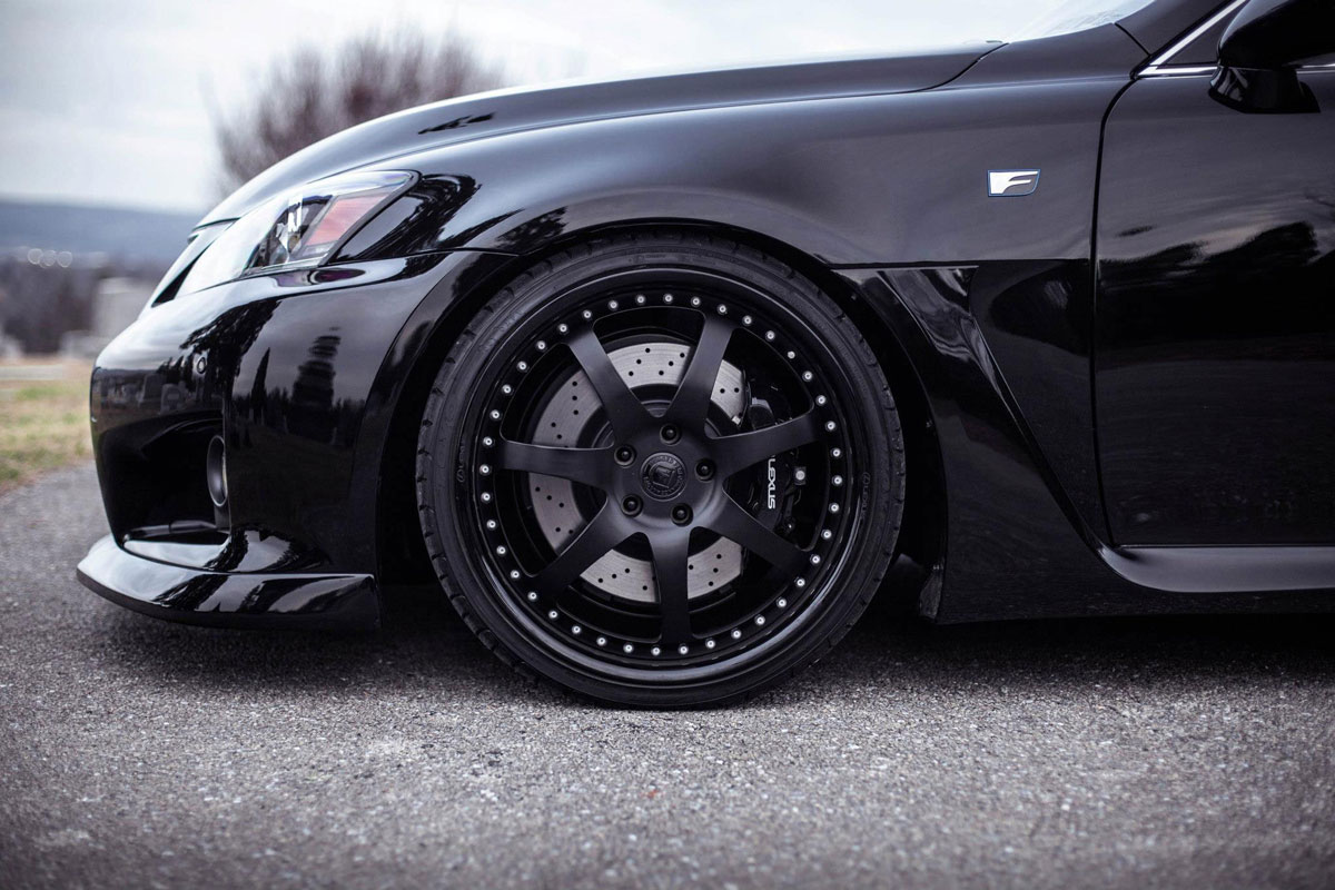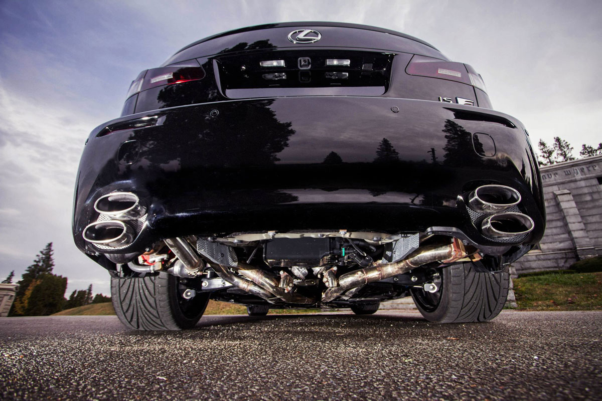 這樣的動力看似夠用,不過這樣的動力在今天來看,似乎已經稱不上性能車了,因此Fox Marketing操刀替IS-F做了徹底的升級手術,全黑的塗裝搭配iForged多片式鋁圈,黑色鋁圈搭配銀色鉚釘及後輪接近負值ET設定下,搭配上全車四輪暴龜,由車尾望去整輛車散發出一種令人不寒而慄的氣息。