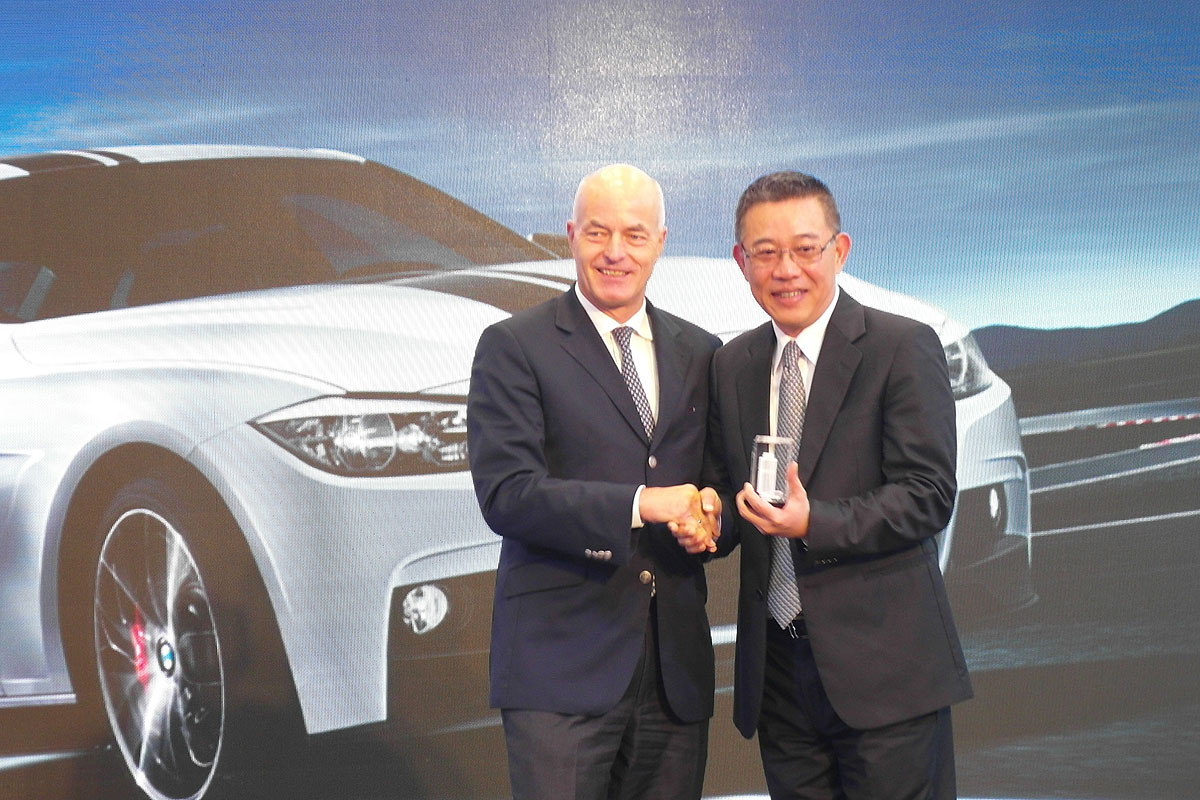 | BMW大中華區總裁的安格(左)來台祝賀台北鎔德董事長簡金鎔新據點開幕。 |