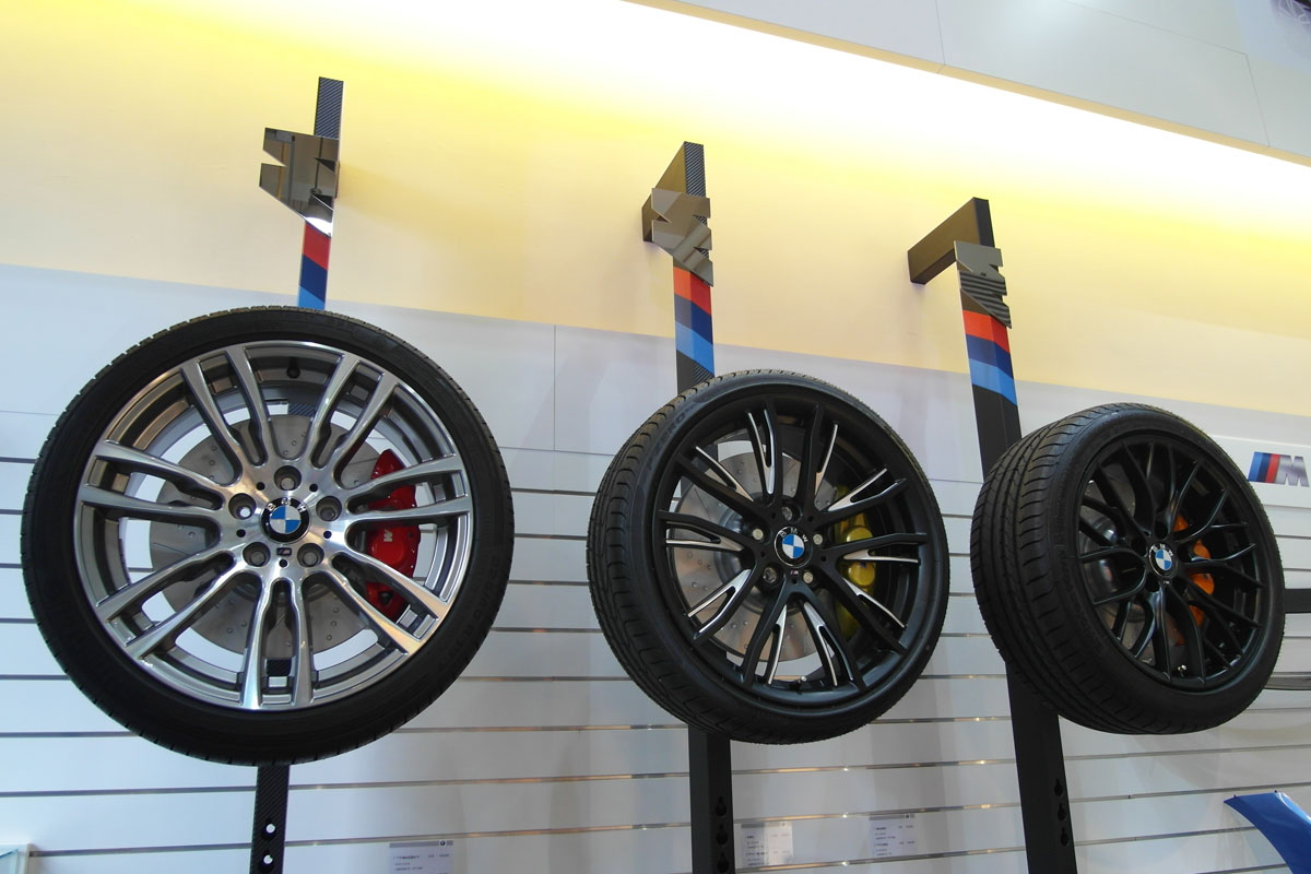 | 很少見碟盤輪圈組合展示,BMW設計特別的架子讓顧客看到輪、圈、碟實際搭配後的樣子,夠貼心吧! |