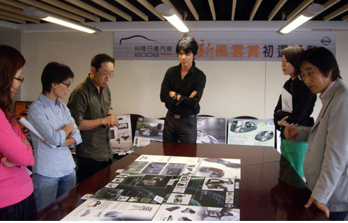 | 初選評審團為各界菁英代表(由圖右二至左)分別為:裕隆日產設計中心島崎敏行協理、華碩電腦工業設計部黃華郁經理、men’s uno男人誌陳美宮副總編輯、裕隆日產技術中心劉家士副理、車輛研究測試中心(ARTC)廖慶秋協理以及裕隆日產設計中心黃興儒經理與小島雄介副理。 |