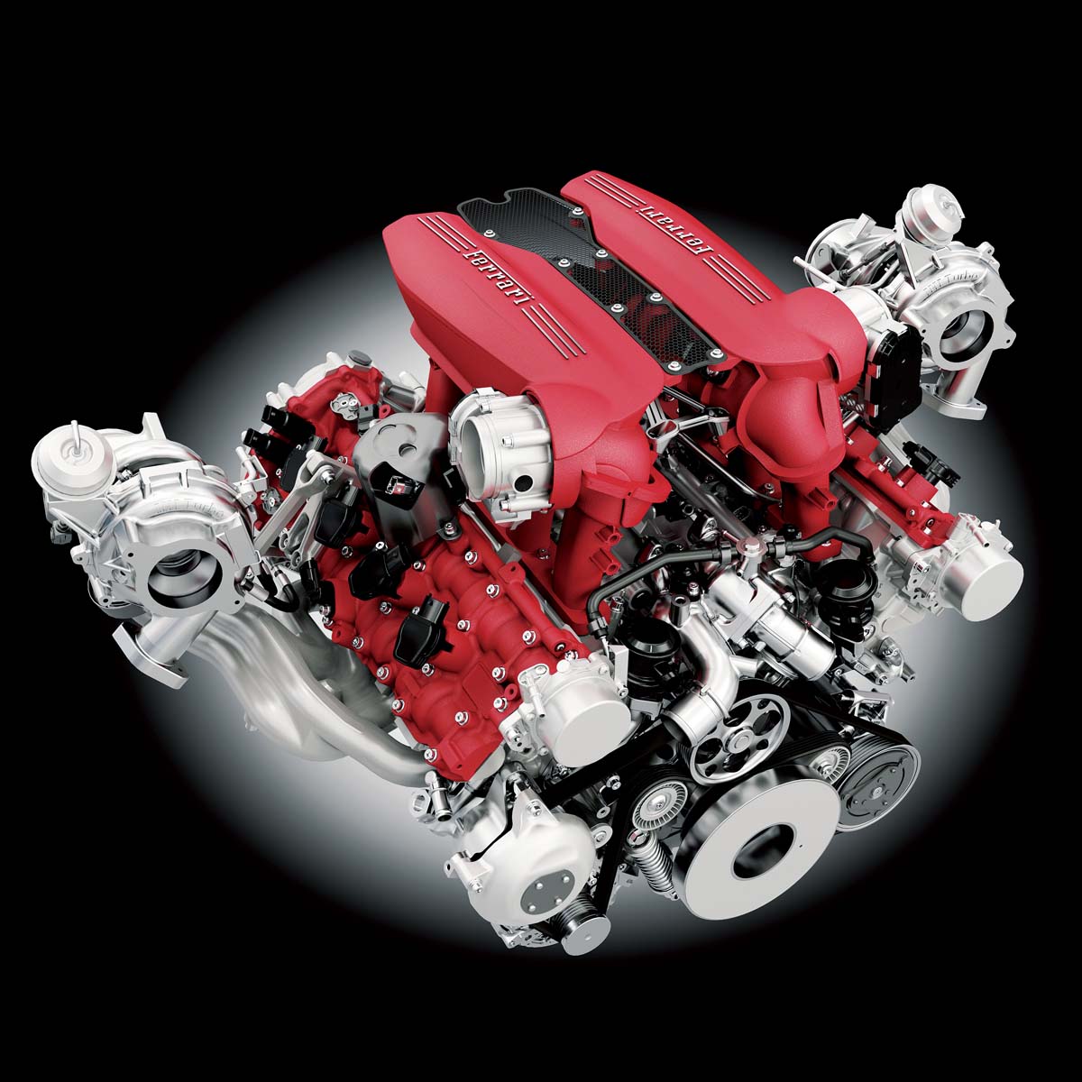 原先大家預期488 GTB會沿用California T的V8雙渦輪引擎,結果其實不然,488 GTB所搭載的這具排氣量3902c.c.的V8引擎,能在引擎8000rpm時創造出670hp(492kW)最大馬力,將檔位放在第七檔時,就能在3000rpm榨出77.55kgm的最大扭力,加上1370kg的車重,從靜止加速到100km/h僅需3.0秒,到200km/h也只要8.3秒,在自家Fiorano賽道測得1分23秒的最快單圈成績,更值得注意的是,一公升汽油可跑8.77km的平均油耗,表現出動力與油耗不輕易妥協的決心。