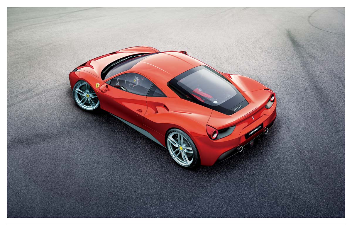 從外觀一看就知道488 GTB長得酷似458 Italia,基本上的設計元素與現行458 Italia相同,不過在兩側後葉子板上的進氣口看起來較為巨大,應該是為了滿足雙渦輪增壓引擎的散熱所需,此外,因應高速所需的空力效果,488 GTB外型做了細節上的修正,因而創造出1.67 Cd(458 Italia為0.35Cd)的低風阻係數,而且原廠表示488 GTB的下壓力增加了50%,且空氣阻力更低了。