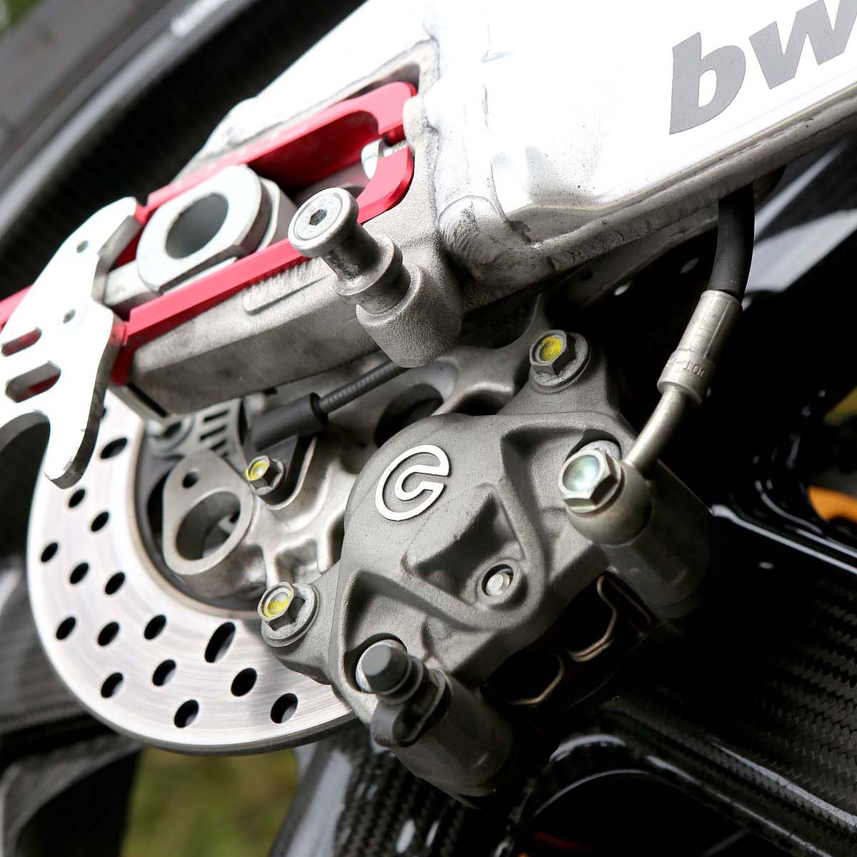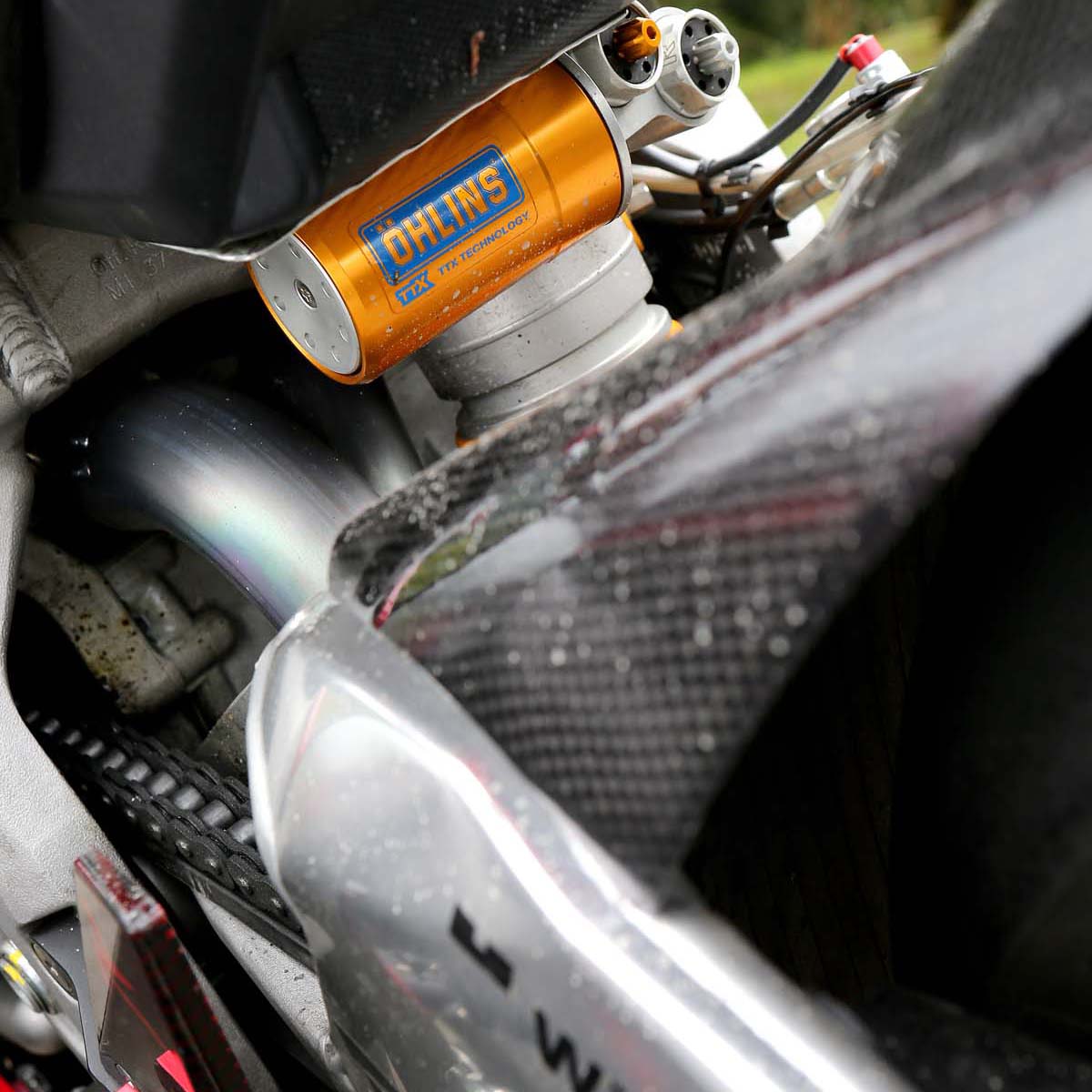 而原廠Aprilia RSV4 ARPC含油水的車重雖然僅有186kg,但車主就是不爽,沒有1:1的馬力重量比車要怎麼騎?因此一交車就把原廠鋁圈拿去埋掉,直接換上兩咖僅有約7公斤(約原廠一半重量)不到的Rotobox碳纖維鋁圈來降低車重,電池也更換上效率佳且更輕的鋰鐵電瓶,另外把手上的競技化開關更是來自於WSBK及Moto GP上的技術,騎乘性能方面目前則是已將後避震提升到Ohlins TTX系列,STM滑離也讓車主可以放心的由6檔直接降到1檔來過彎。