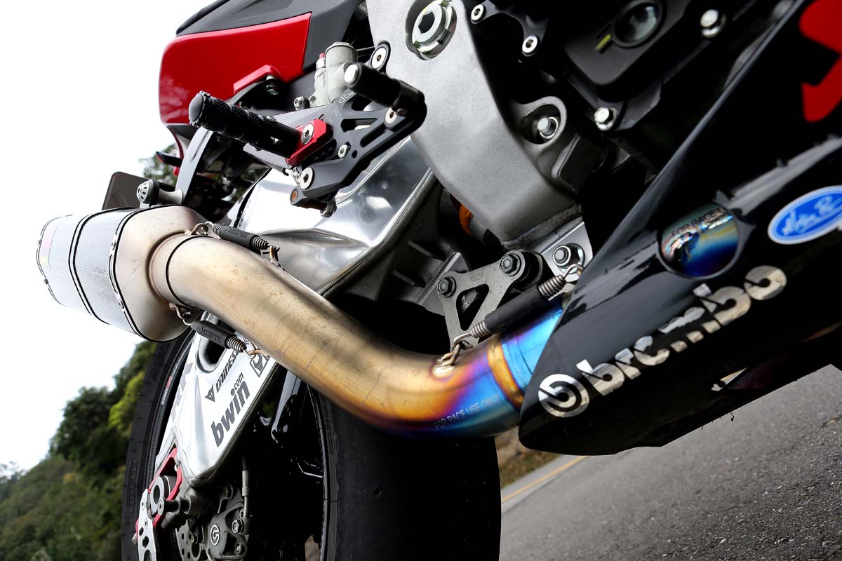 | 排氣管部分蠍子管已經是第二套了,原先的短管讓本來低速反應就較差的V4引擎更難駕馭,因此才會整套連同ECU及可變歧管直接更換掉。 |