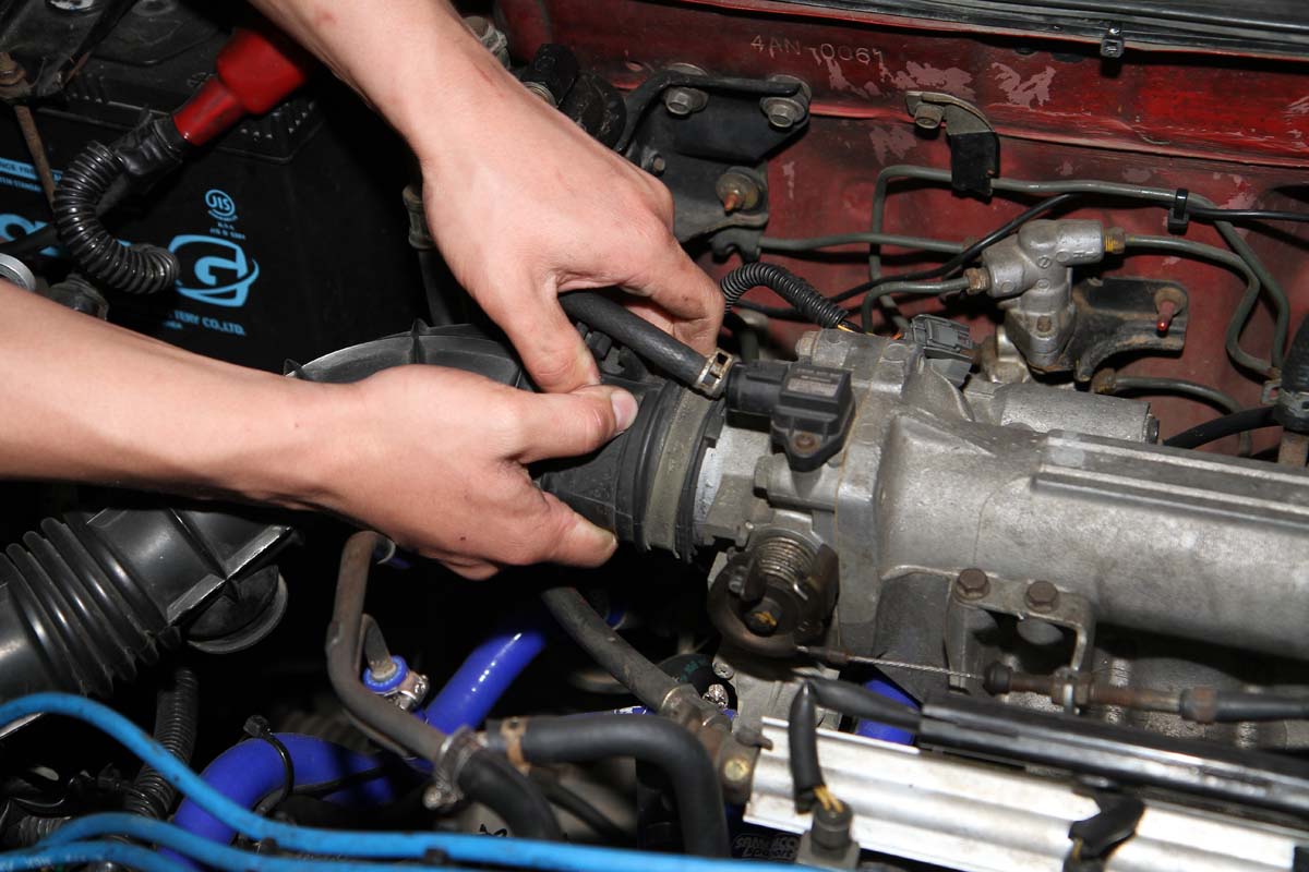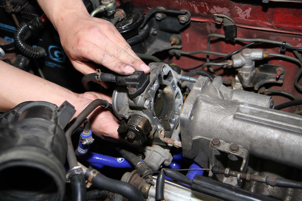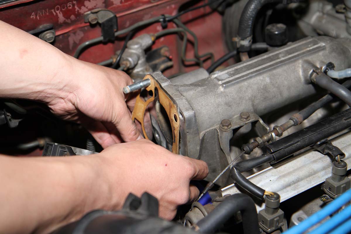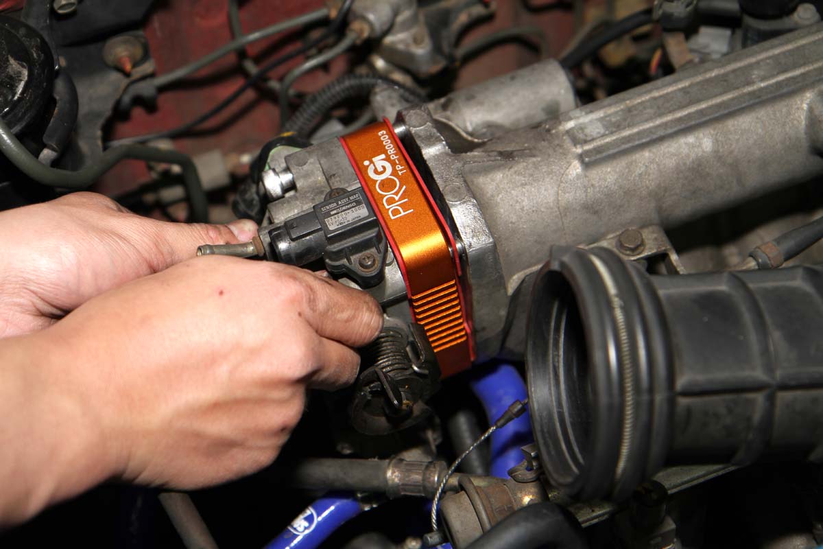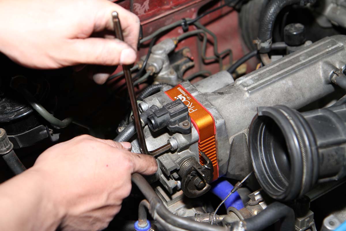 安裝此產品前需將節氣門整個拆下,因此難度有些高,需具備比較高階的DIY技術才能自行安裝,以示範的K6單凸沒VTEC引擎為例,拆卸節氣門前需先將安裝在節氣門上的進氣軟管、活性碳通氣管、兩顆Sensor的插頭與油門鋼索拆下,之後再把固定在節氣門上的四顆螺絲卸除,就可將節氣門與進氣歧管分離。此時、進氣歧管上還留下兩根螺絲在上頭,可將剛剛拆下的兩顆螺帽套入,轉到底後再用力轉底部第一顆螺帽,就可以把這兩根螺絲拆下。