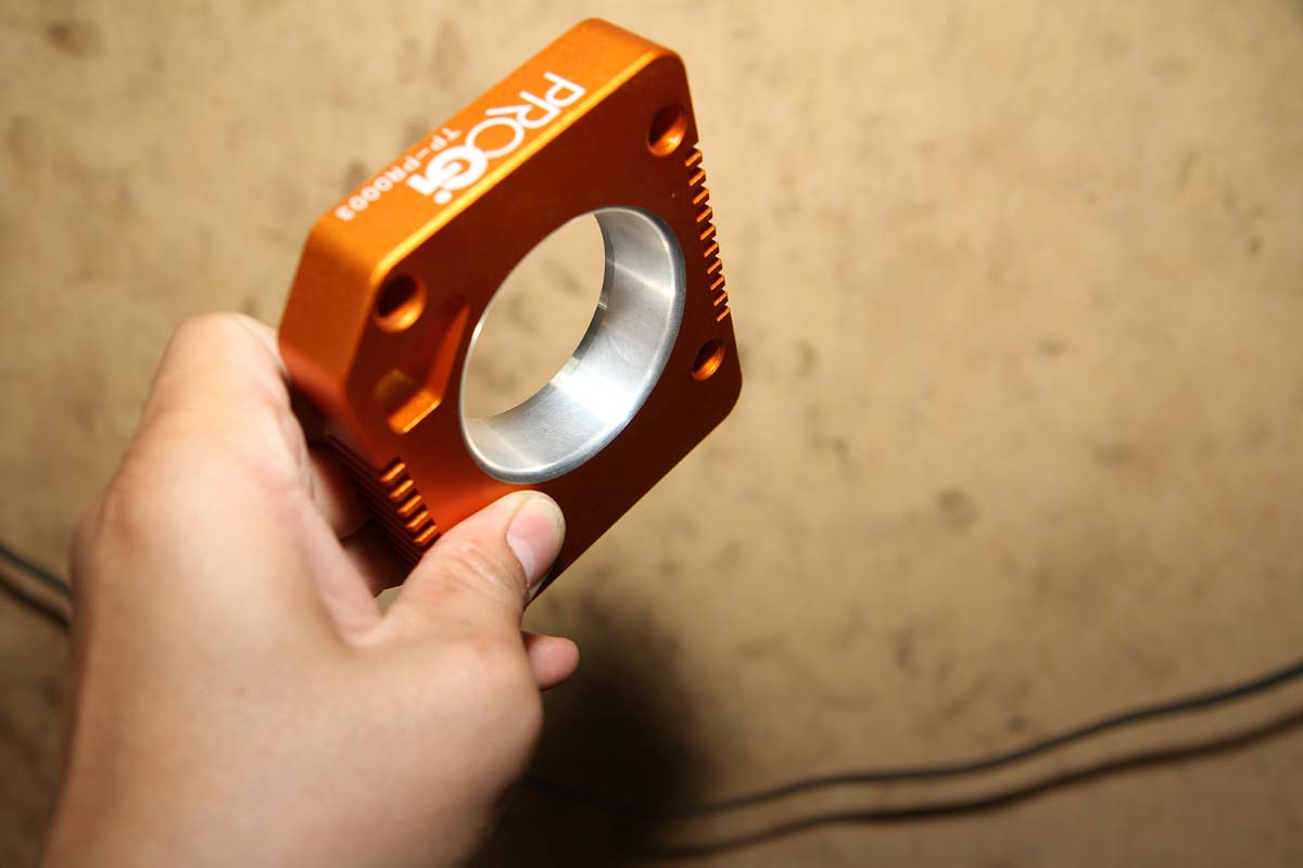 這次要教大家安裝的產品是能提昇動力的節氣門墊高片,其外型是一片鋁合金CNC切削而成的方型片狀物體,厚度大約有2公分左右,中央有圓形孔洞,安裝的位置在節氣門與進歧管間,改裝效果具廠商表示能透過其喇叭口的進氣孔,提高空氣流速,使燃燒室獲得更佳的填充效率,反應在車輛上就是加速會變得比較輕快。