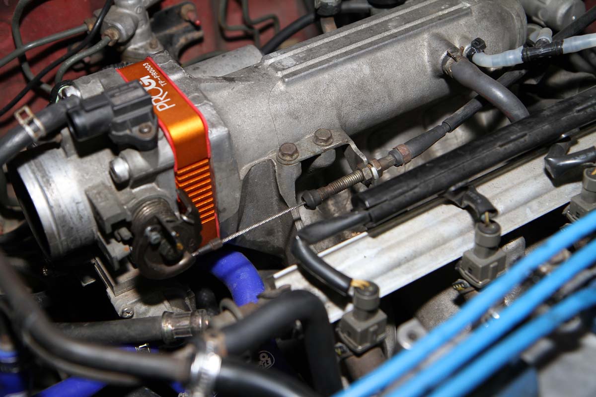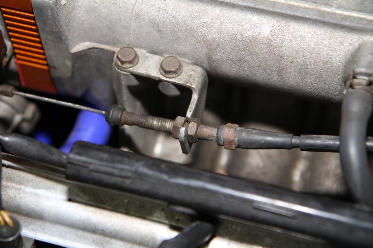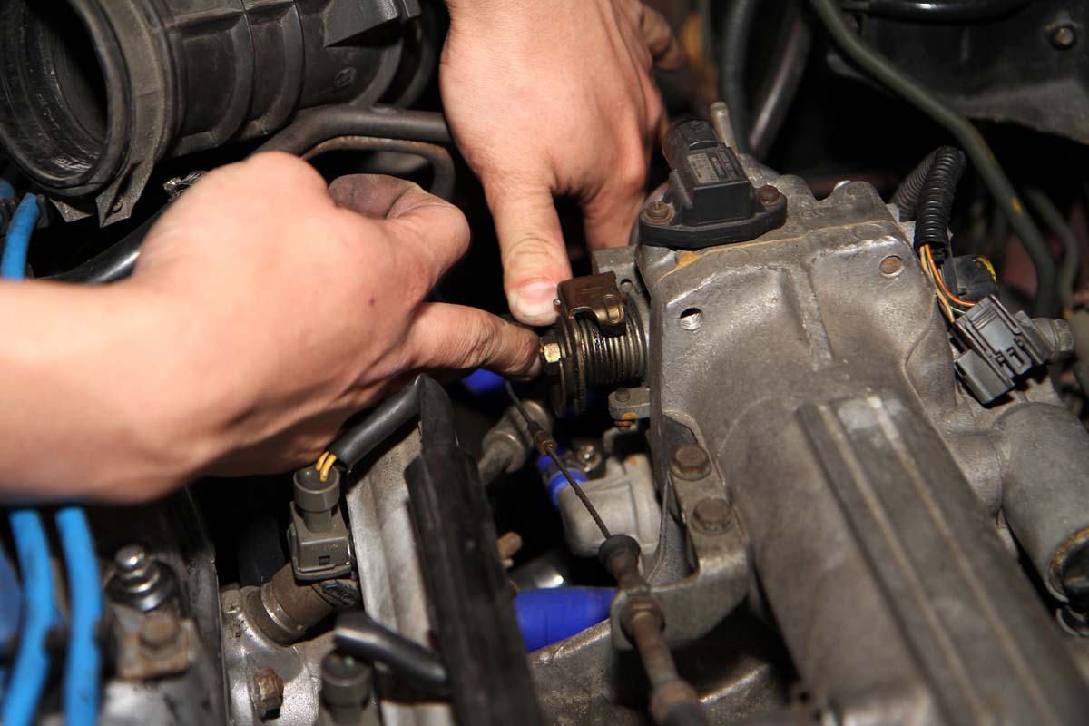 | 作業要點2:節氣門墊高片安裝完成後,需增加油門鋼索的長度,才能應付固定位置向前的節氣門,調整方式再進氣歧管上的鋼索固定螺絲上。 |