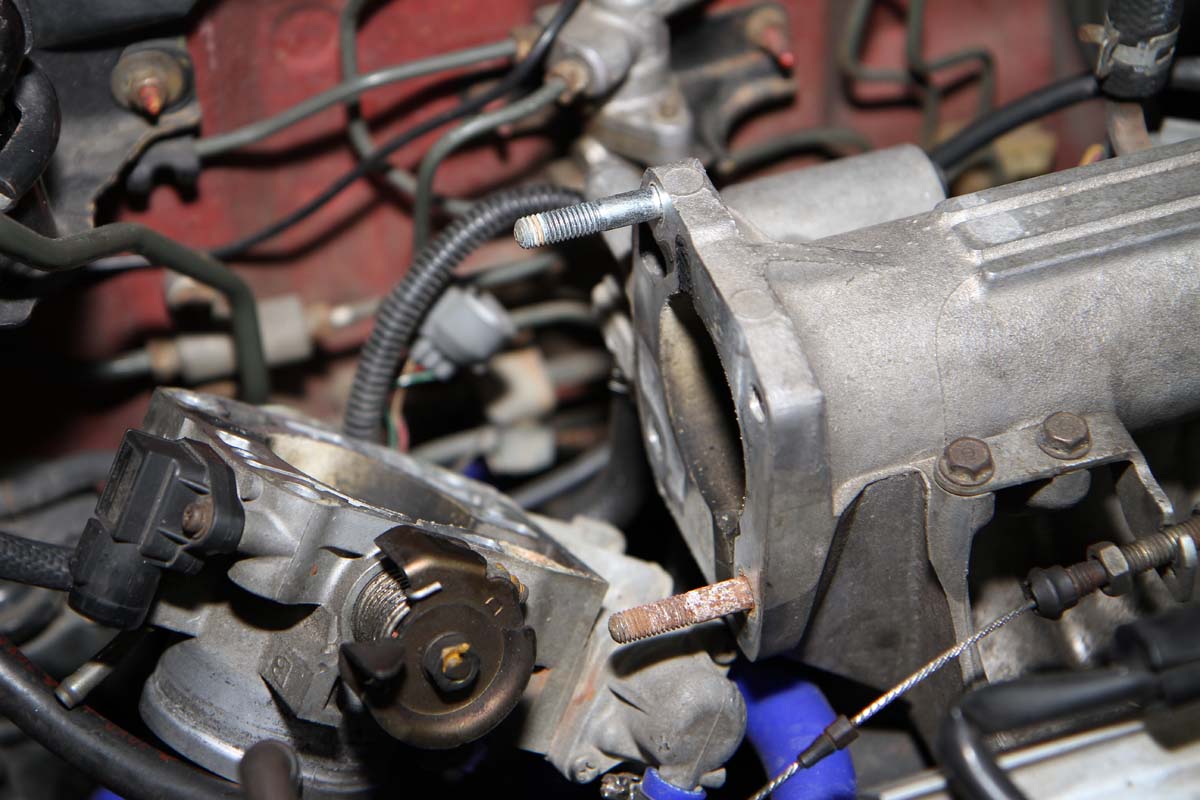 | 這兩根沒有螺帽的螺絲柱要想辦法拆下,才能安裝節氣門墊高片,拆卸技巧很簡單,只要將原本鎖在這兩根螺絲柱上的螺帽裝上轉到底,再用扳手逆時鐘旋轉,就可將螺絲柱拆下來。 |