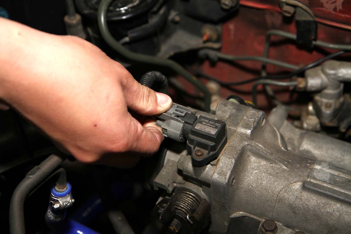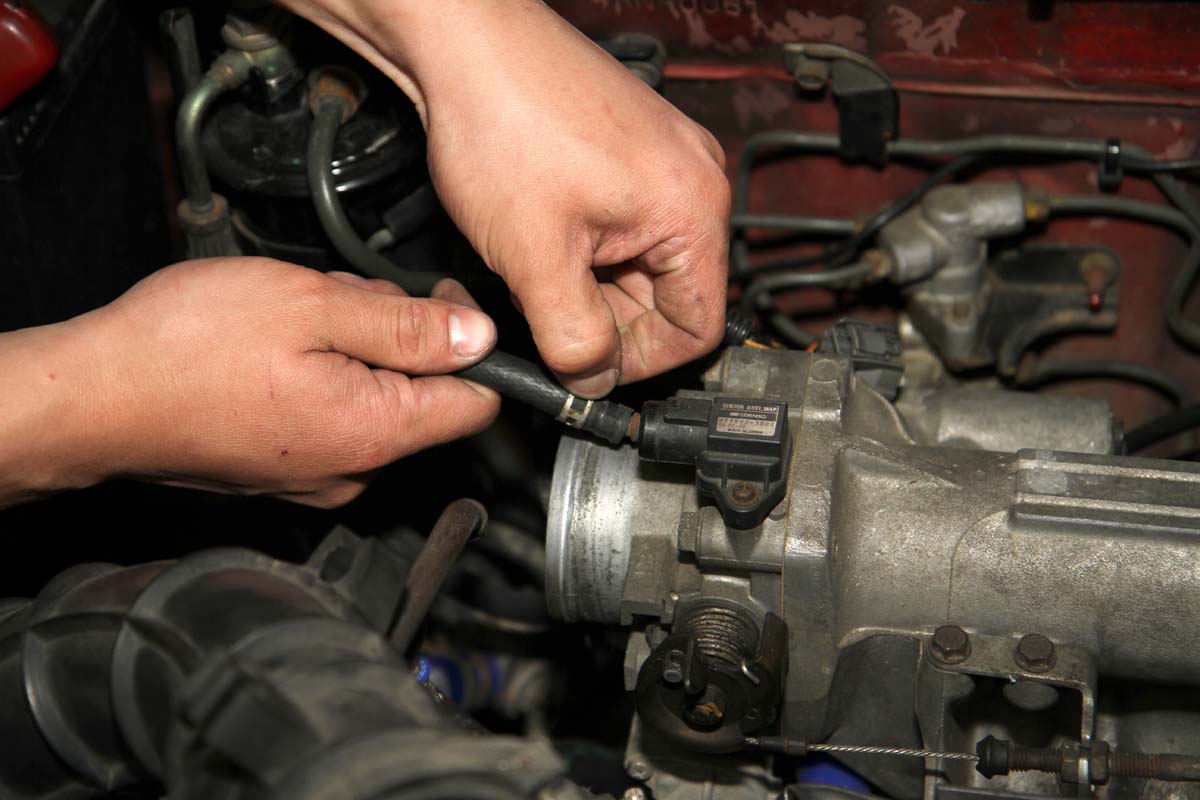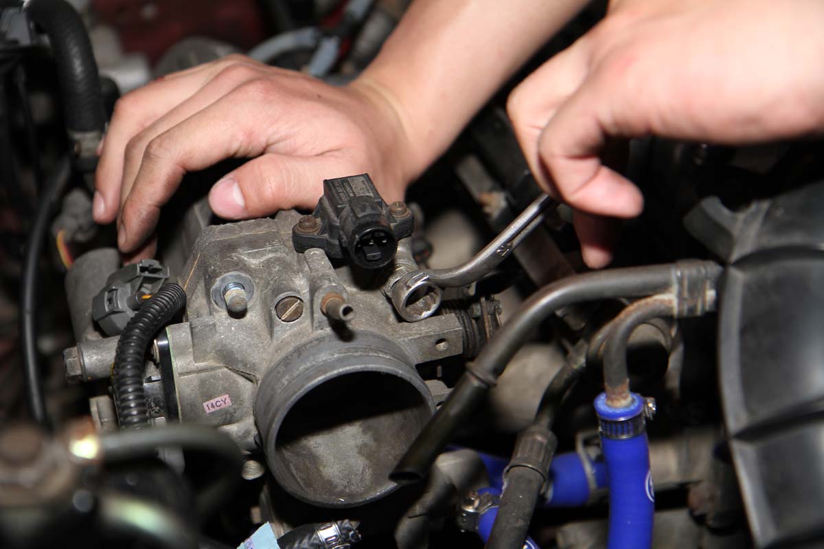 | 拔出感應器插頭 節氣門上通常會設有感應器在上頭,例如歧管壓力感知器或節氣門開度感知器,拆卸節氣門前需先將其插頭拔出。 |