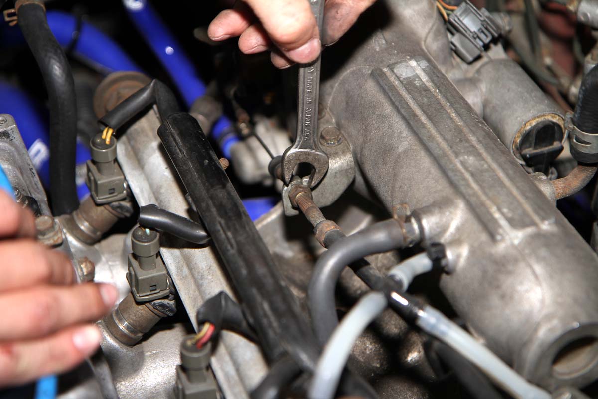 | 轉鬆油門線固定螺絲 接著使用10號開口扳手將固定在進氣歧管上的油門線固定螺絲轉鬆,建議可先把油門線退到最後面,之後再調整鬆緊度。 |