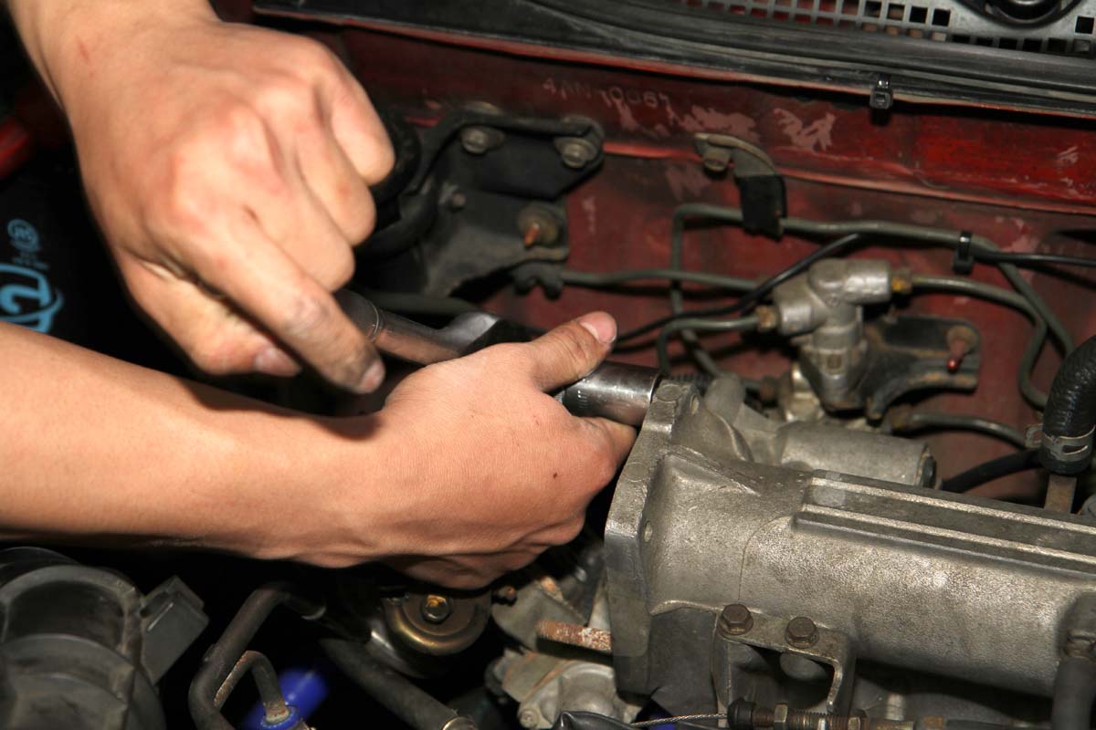 | 拆卸螺絲柱 此時進氣歧管上應該若還留有螺絲柱,則可使用裝上原本的兩顆螺帽轉到底,然後利用扳手逆時鐘轉動第一顆,就可把開螺絲柱拆下。 |