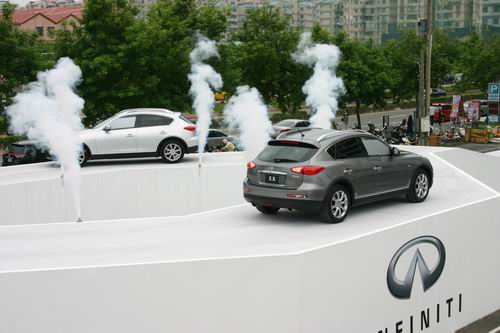而為了讓大家更能實際體驗及了解到「AVM 360度環景顯影」這套系統的功能作用,裕隆日產特別舉辦了這一場INFINITI EX AVM「空中體驗秀」,讓專業試車手在所架設的狹窄表演車道上(高為2.5公尺、寬度僅3.2 公尺),開著兩側車窗皆有貼布遮蔽車外後視鏡的EX車款,進行倒車爬坡及行進等動作表演,以充分展現出AVM環景顯影系統的精準度與實用性。