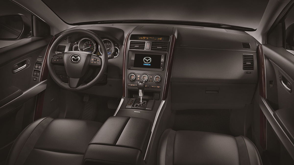 CX-9以穩重的黑色調打造日系精緻內裝,淳黑鋼琴烤漆排檔座、方向盤飾板,呼應高質感中控台與門邊飾板,展現豪華旗艦運動跑旅的尊貴氣質;前雙座具備電動調整與加熱功能,而HVAC三區獨立恆溫空調除了讓前雙座各自選擇舒適的溫度,後排乘客也擁有獨立的空調出風口及專屬空調控制介面。中央控台搭載七吋螢幕的多媒體影音導航系統,採用高科技直覺式多點觸控操作介面,倒車顯影、多種音樂及影片格式讀取播放,還可藉由Wi-Fi熱點或手機分享3G訊號上網瀏覽。