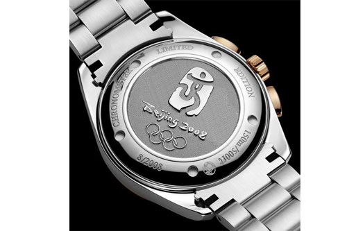 錶背鐫刻了北京2008年奧運會標誌及限量號碼,與秒針上的奧運五環標誌互相呼應,突顯了歐米茄自1932年以來,一直擔任奧運大會指定計時器的非凡地位,也直接說明了歐米茄海馬Aqua Terra計時腕錶的紀念及收藏價值。