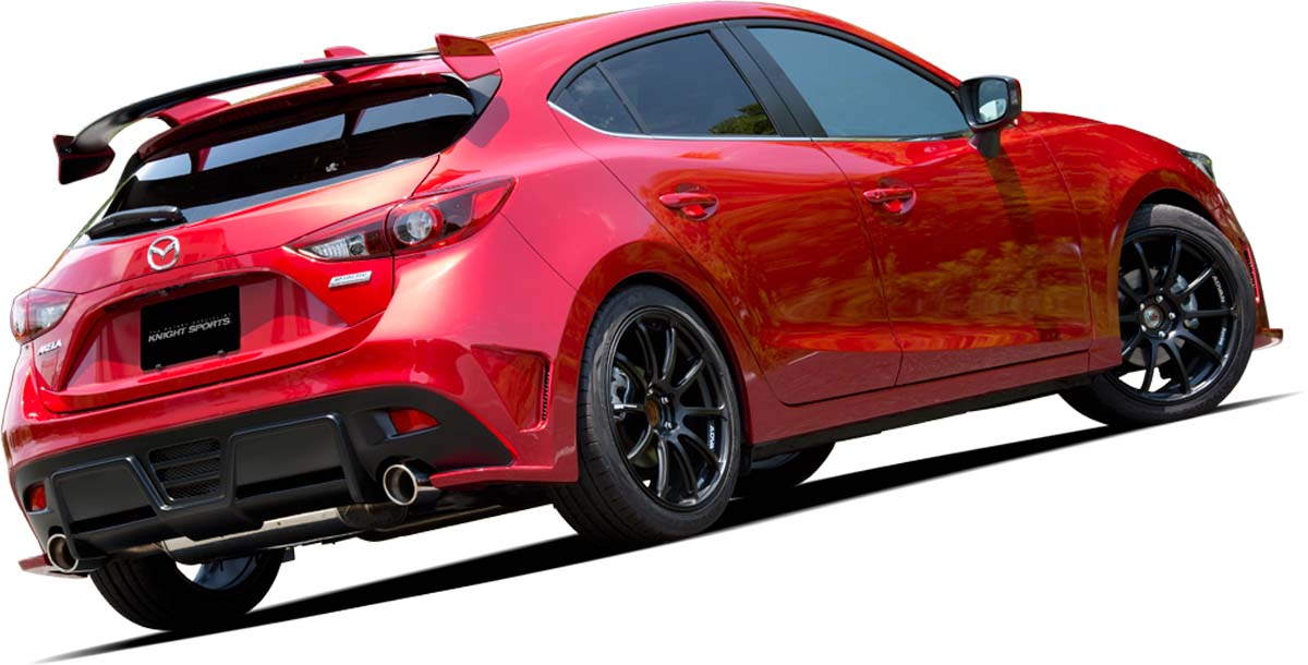 | Knight Sports版的Mazda3,前保桿以大量黑色霧面烤漆面積的設計,來凸顯改裝氣息,車尾後保桿已換成改裝部品,下半部可以明顯看到新增空力設計,車頂的尾翼也比Autoexe的大上一些,整組套件更為高調,安裝後有著更像改裝車的感覺。 |