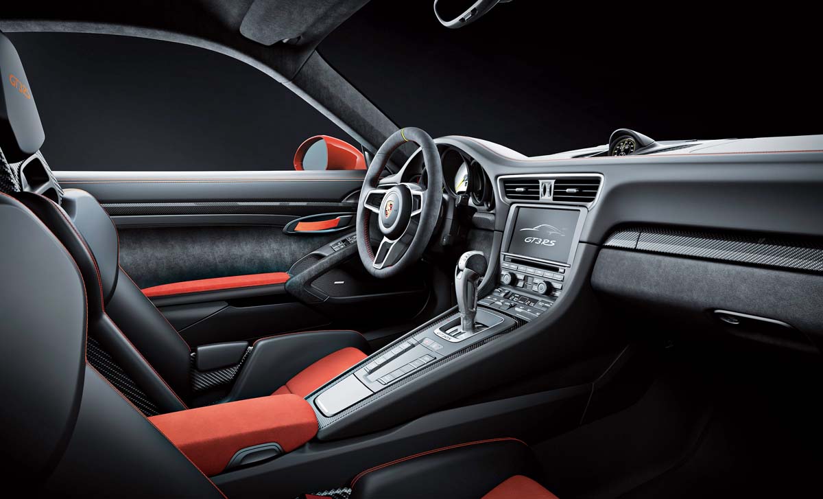 車內為營造更濃厚的競技風格,內裝方面除了繼續採用Alcantara麂皮材料打造最豪華的乘坐空間外,但其他部分則調整為更像賽道用車的車艙設定,如賽車椅仿效918 Spyder的規格變成全新桶型設計,另外還有Clubsport運動化套件,讓車艙加入前座後方的防滾籠結構、滅火器以及電池總電源開關裝置等。車主另可選購跑車計時套件,並且透過Porsche Track Precision App來計算自己的單圈時間,並記錄多項駕駛參數。