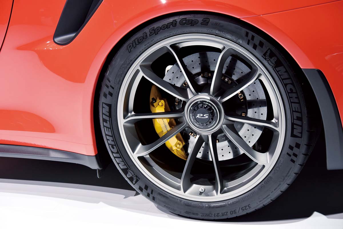 血統上擁有24小時Spa耐久賽和利曼24小時耐久賽多項賽事冠軍光榮傳統的911 GT3 RS,來到新世代車款同樣獲得了相當接近賽道的套件設定,模樣自然比911 GT3更為狂野囂張。與一般991各車型甚至GT3版本不同的是,RS版本在車身上多了不少工廠賽車般的特徵,如前輪拱後方的導流氣孔、後輪拱前側的進氣槽以及更為驚人的大型尾翼等,頂篷採鋁鎂合金材質打造,與車身上多處碳纖維用料及尾翼一同達到輕量化的效果,若再加上全車多項輕量化零組件,RS車重僅1420公斤,比一般911 GT3車款少了10公斤左右。