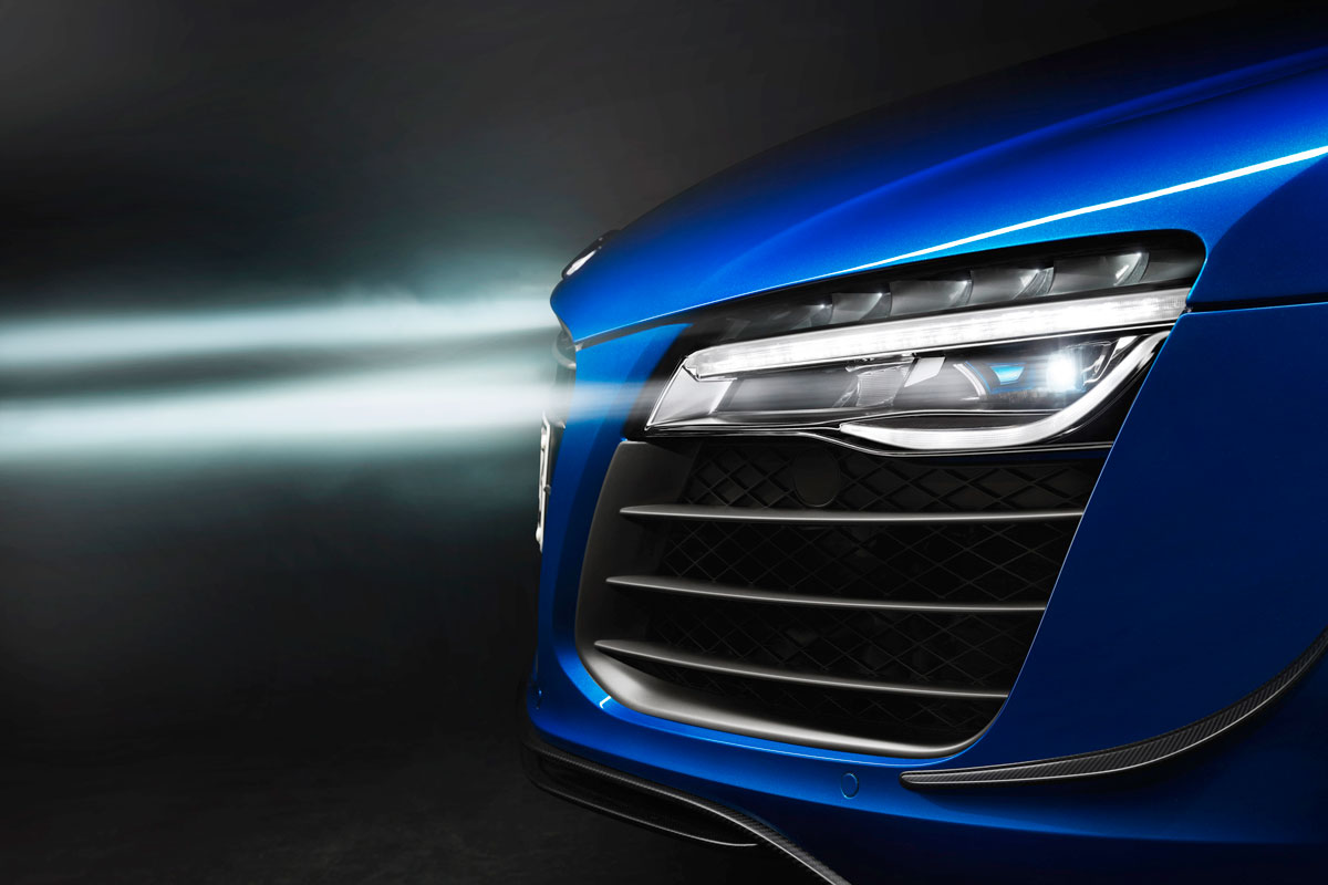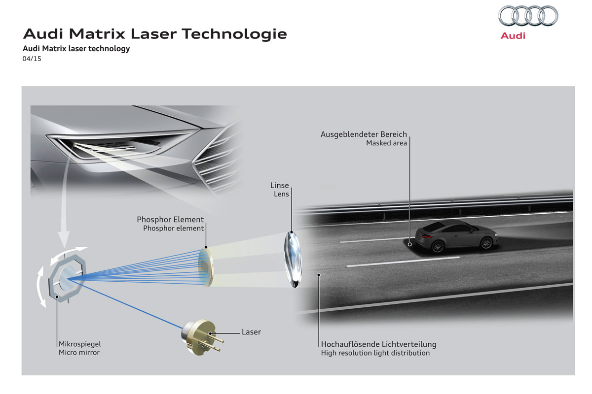 矩陣式雷射頭燈乃根據先前的LaserSpot雷射燈具發展而來,我們已經從R8 LMX車款上看到Audi在雷射照明技術上並未落後於對手,而矩陣式雷射頭燈則是利用一面微型鏡面來改變雷射光束方向;車輛低速行駛時,光線將能有效分布到較大的投射區域上以提供駕駛者更寬廣的路面照明效果;當車輛高速行駛,燈組光圈角度便會縮小,光線強度便會跟著增強,有利於高速公路行駛時所需的照明亮度;此外,光線也能隨著角度的調整精準的投射在正確的地方,在控制特定區域上光線停留時間,不同照明區域的亮度也會跟著改變。