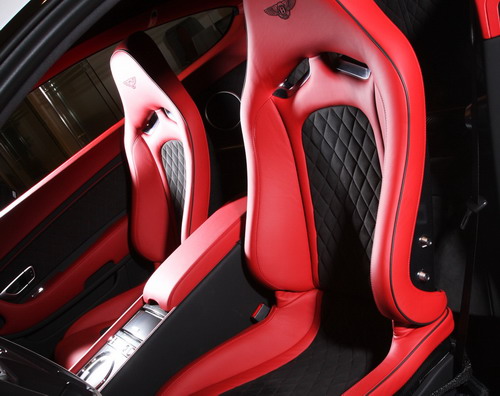 | 一對碳纖維桶型跑車座椅由火紅菱格紋皮革包覆。 |