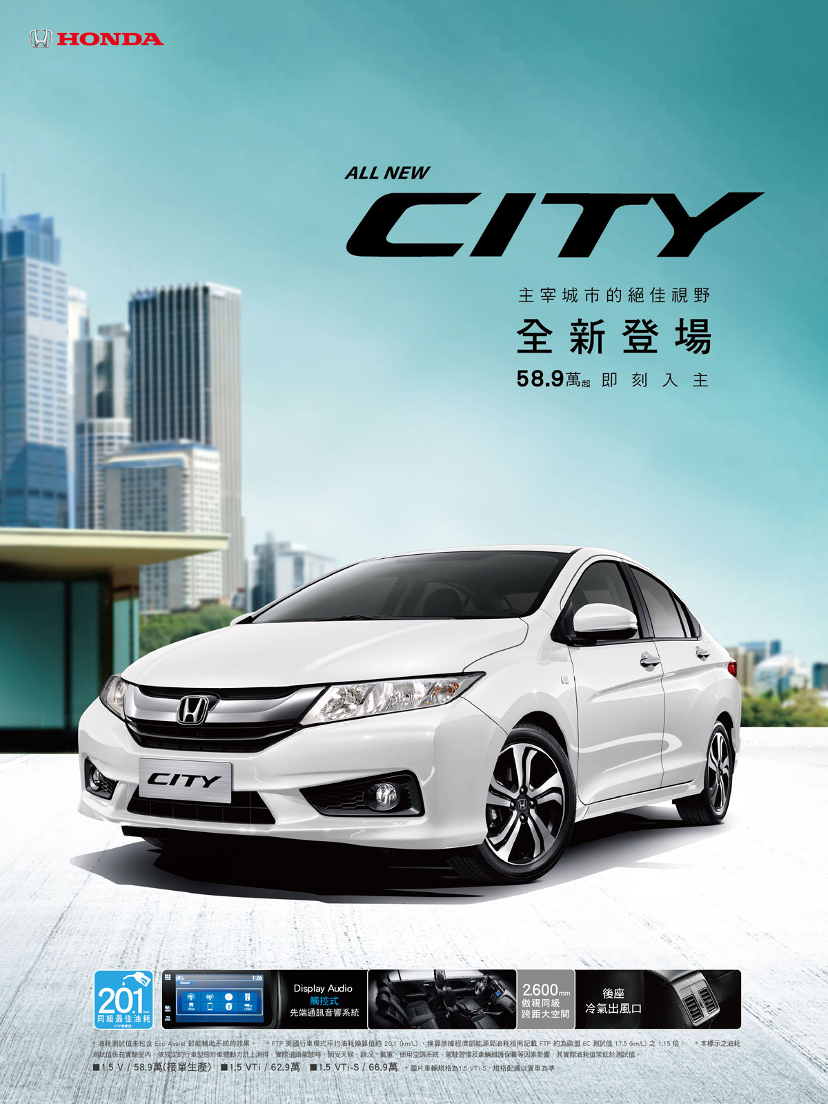 Honda Taiwan自成立以來,以「三喜哲學」(購買的喜悅、銷售的喜悅、創造的喜悅)為經營理念,及「Share Happiness」為企業活動的方針,除持續強化產品及服務品質外,更陸續調升CIVIC、FIT、CR-V等車款的性價比,希望朝向創造台灣大眾的喜悅邁進。以「世界第一都會房車」概念研發的New CITY,在Honda「車室空間極大化,機械空間極小化」的MM思想具體化實踐下,保有1.5L靈活易駕駛的優勢,並利用車身尺寸UP-CLASS概念,創造出超越同級極具壓倒性、直逼中型房車的超大車室空間,完美展現越級距的駕駛視野廣度與乘坐舒適性。