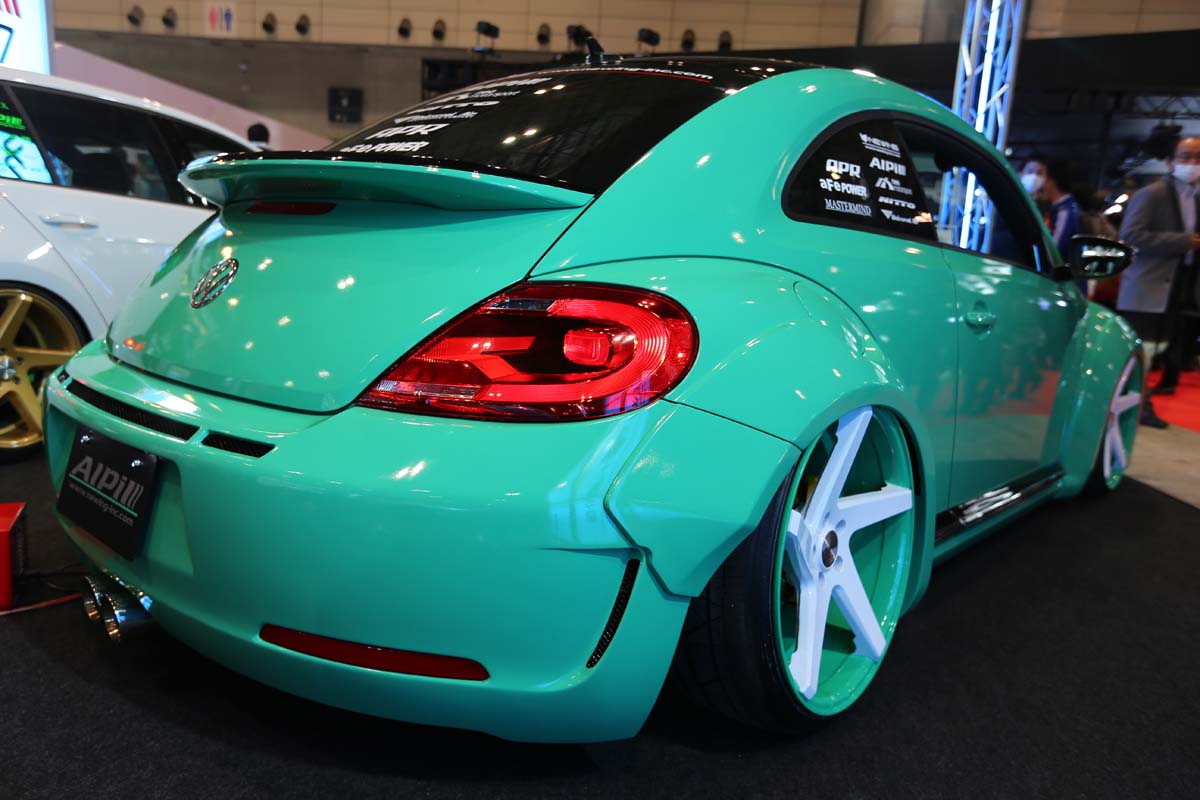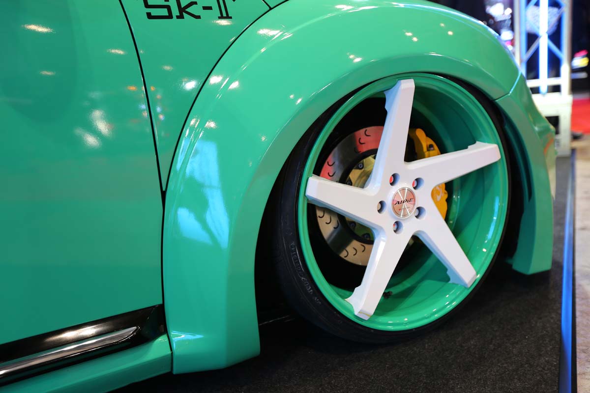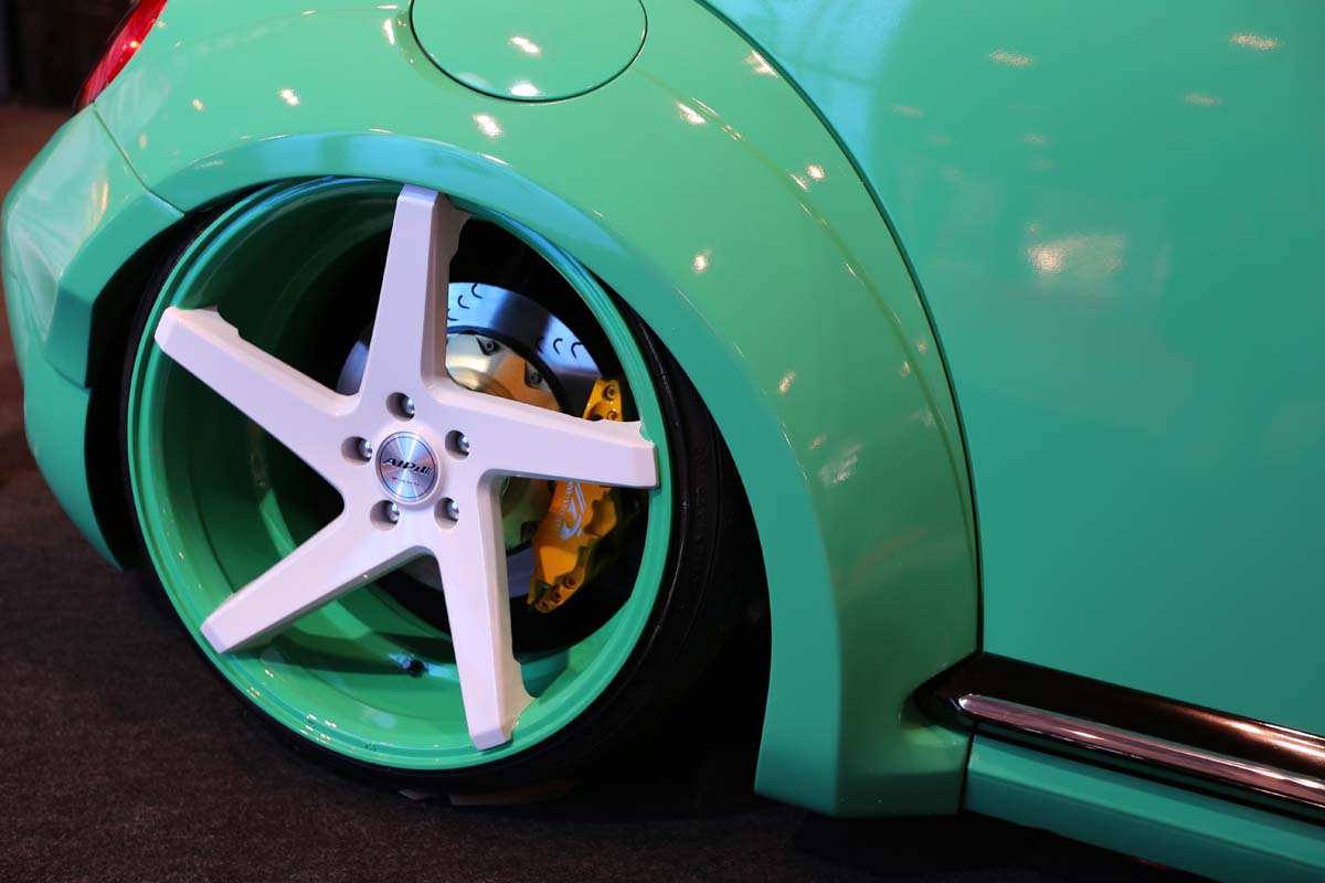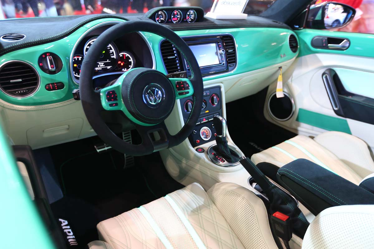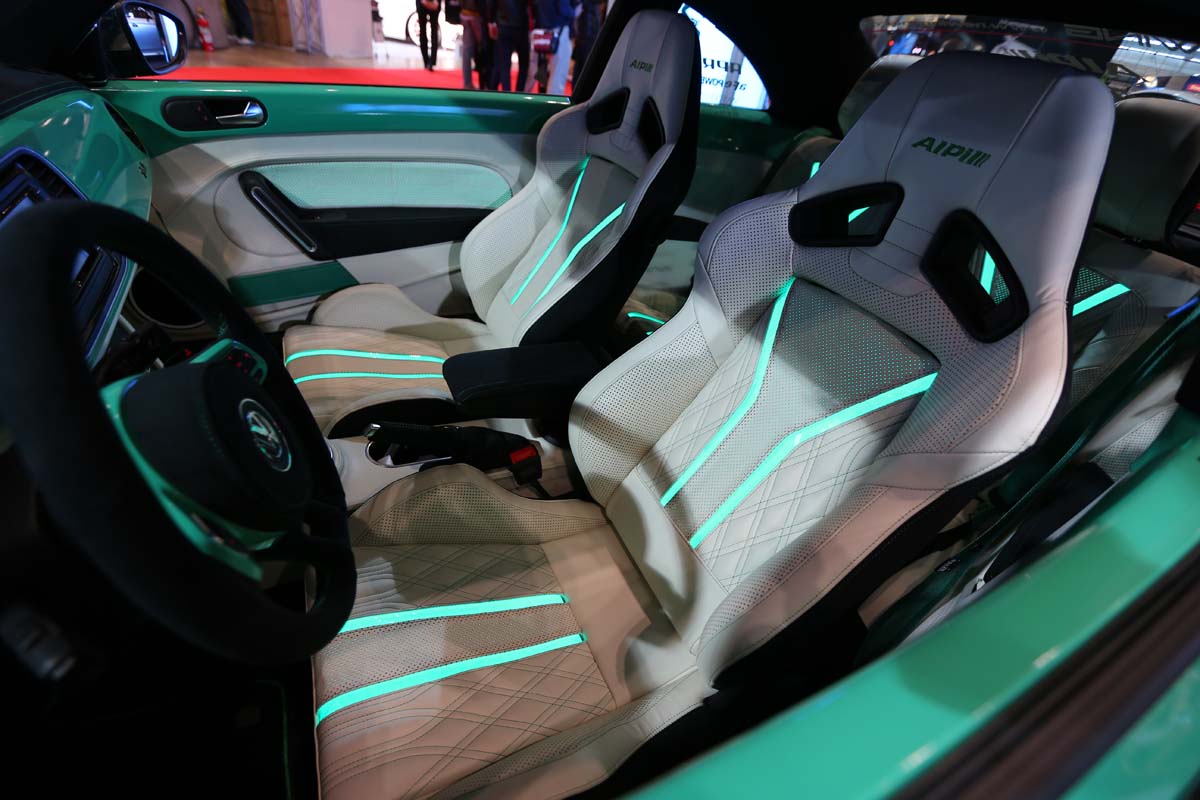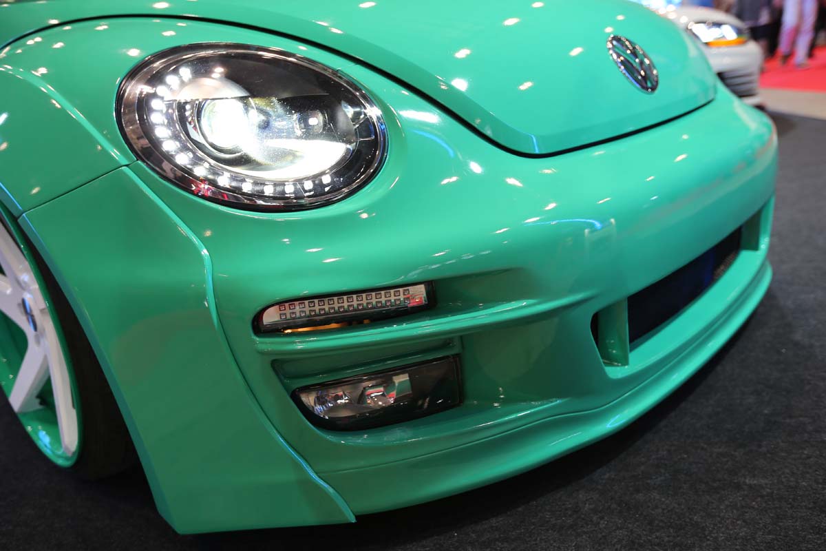 通常車子能夠掛上RSR的銘牌代表超高性能,但是在改裝品牌Alpil規劃中卻有不同的設定,第一眼看到綠色的Beetle,除了被其鮮豔色彩迅速吸引之外,採用寬體造型的空力外觀已經大量融入性能風格,從前保桿造型就能明顯看到具有Porsche 911車型的設計影子,進氣壩與兩側的霧燈及LED日行燈,有效提供冷卻與照明功能,不過Beetle本身前後葉子板已經具備獨特曲面線條,但是Alpil仍是額外增加寬體板件,透過氣壓避震器與20吋輪圈以營造出與眾不同的視覺感受。