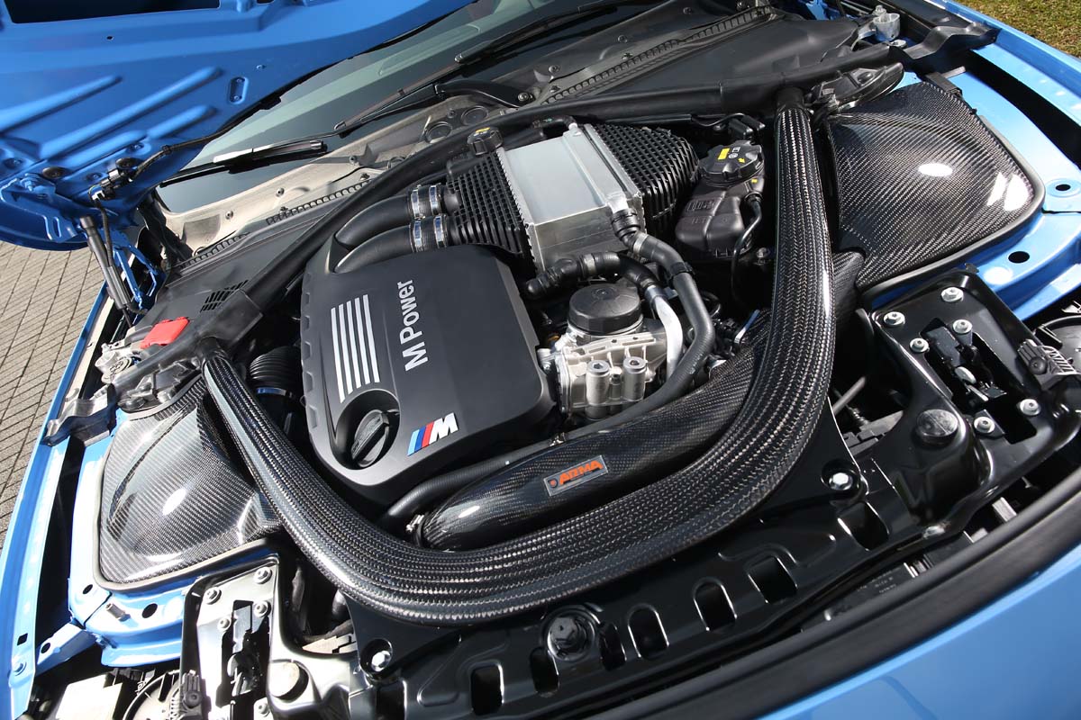 | BMW M4採用對稱配置的進氣系統,ARMA為此開發碳纖維集氣系統來強化進氣效能,並且有效控制進氣溫度,最大輪上輸出提升至470.9hp/65.6kgm。 |