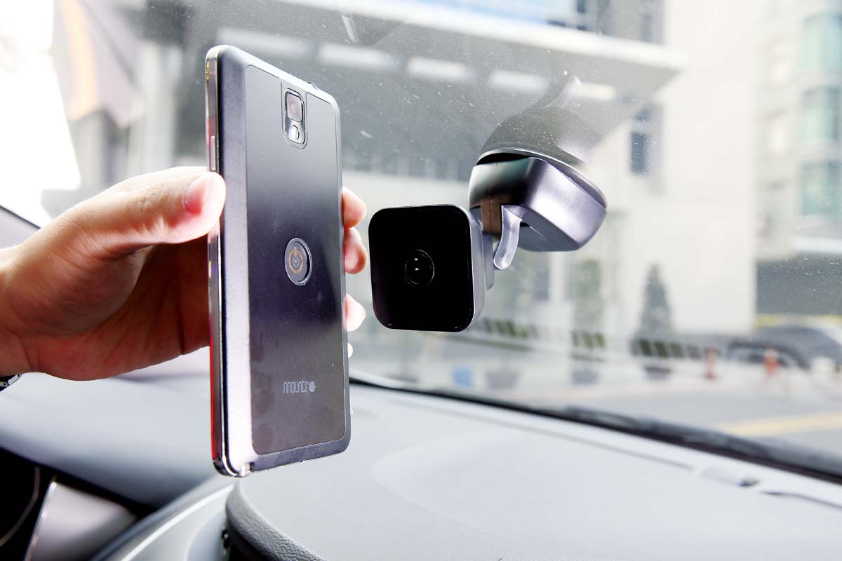 | Mountr透過磁力與接點式非線圈感應式,在固定手機同時也能充電。 |