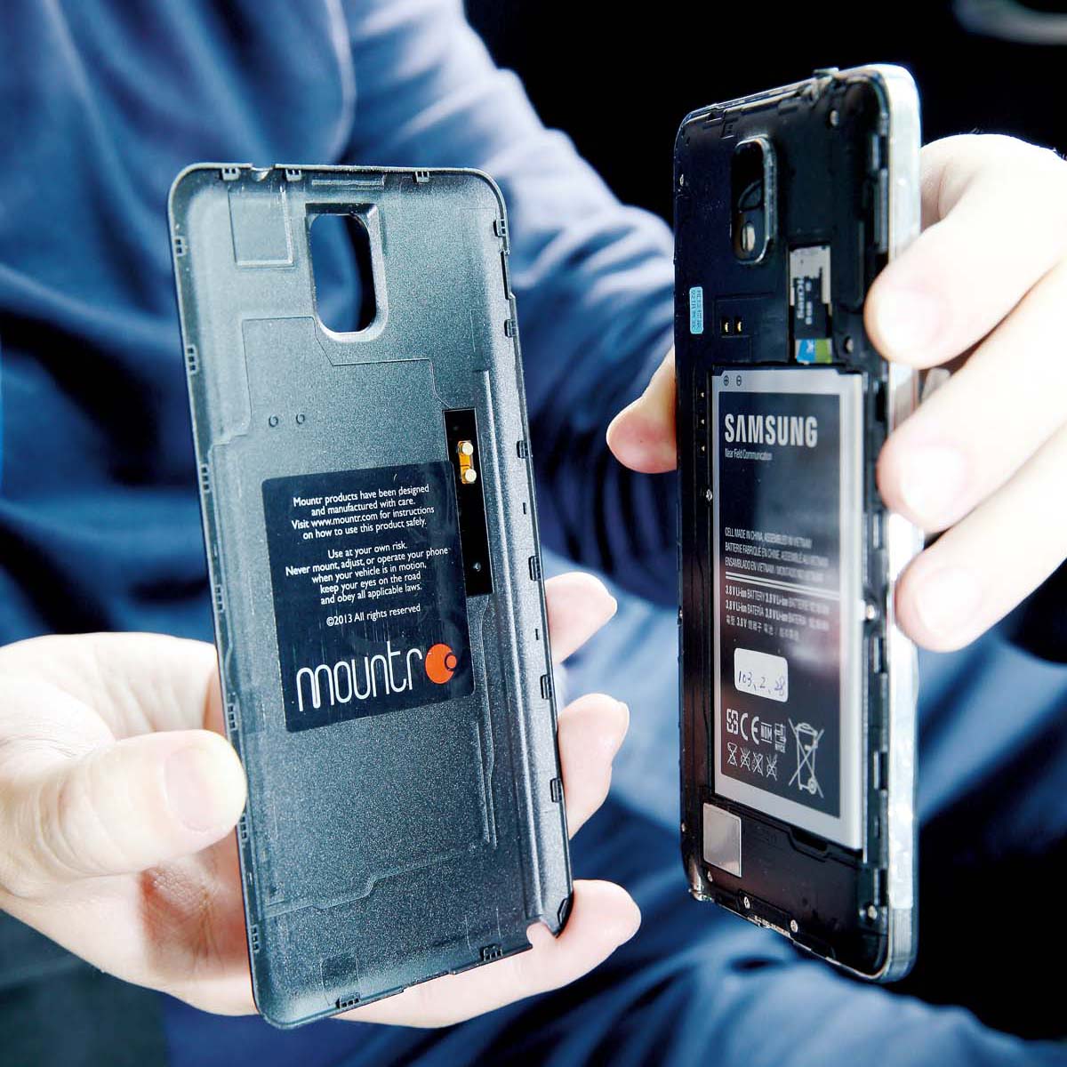 這是一款同時結合充電與手機架的產品,Mountr採用背蓋式充電方式,使用前先將手機換成專屬保護殼或背蓋(目前僅提供iPhone 5 / 6 / 6+、Samsung S4 / S5 / Note 3),底座部分則採強力磁力設計,不僅能固定手機,背蓋內的接點式非線圈感應式,亦能同時替手機進行充電。將充電器與固定座兩者功能相互結合,不僅展現科技感受,也可減少分別購買或各別安裝造成車室凌亂的困擾。