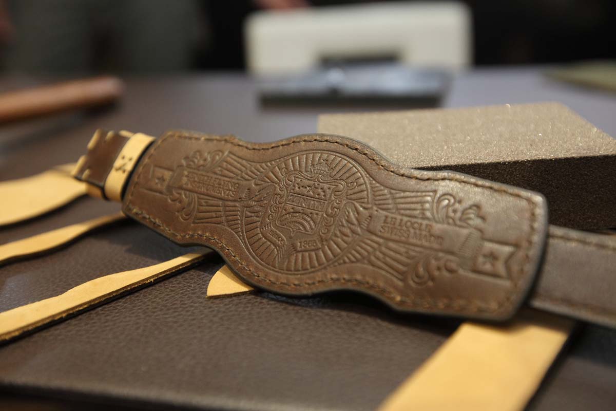這款全新的萊特兄弟兩地時間限量腕錶採用一款獨特的飛行錶帶,而這錶帶背後的故事,也頗具戲劇效果。時間拉回2013年的6月,那時Zenith的前總裁Mr. Jean Frederick Dufour正在台北舉辦飛行員腕錶的上市記者會,在會後準備匆忙離去機場之際,撇見現場佳賓中Alex Huang手上戴的特殊鞣皮錶帶,這讓他大感驚豔,連忙詢問Alex手上佳品是如何得來?Alex委實告知自己手上作品出自沃坦匠藝,也是他服務的公司;就因為這段邂逅,讓台灣與世界接軌,促成了一段台瑞合作的姻緣。