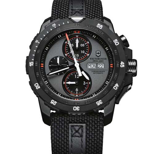 聊軍錶,怎麼能不提到Victorinox Swiss Army。從全世界第一把軍用小刀開始,Victorinox Swiss Army就早早已是每個男人的心頭俎,嘴上肉;光說文解字一番,我們就能看出Alpnach來頭不小,Alpnach的命名是翻拷自瑞士海拔3000公尺上的直升機基地之名,從錶圈到錶盤上的計時小秒針與計時盤,都可看出此錶款與戰鬥直升機的儀錶板以及機葉轉動軸間的關係非比尋常。除了造型陽剛外,跟自家旅行箱同款材質的錶帶(高科技纖維包覆牛皮),更是一大賣點。