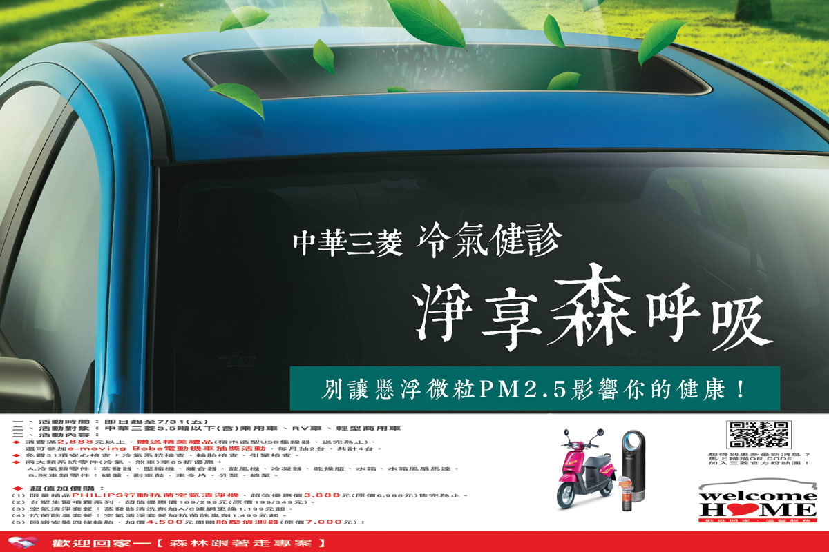 中華三菱夏季健診『森林跟著走』活動開跑。即日起至2015年07月31日止,針對進廠車輛,將為您的愛車提供冷氣系統、輪胎及引擎等31項免費安心健診,於活動期間,更提供您冷氣類八大零件(蒸發器、壓縮機、離合器、鼓風機、冷凝器、乾燥瓶、水箱、水箱風扇馬達)及煞車類五大零件(碟盤、剎車鼓、來令片、分泵、總泵)85折優惠。此外,為體恤三菱車主免受空污PM2.5懸浮微粒困擾,特別推出空氣清淨優惠套餐及限量PHILIPS行動抗菌空氣清淨機55折優惠,且回廠消費滿2,888元,即贈送限量精美禮品,還有機會抽中e-moving Bobe電動車。