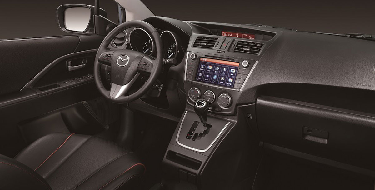 延續外觀流線圓弧輪廓的中控台造型,15年式Mazda5頂級影音旗艦型提供高科技直覺式多點觸控操作介面的整合式DVD影音娛樂系統,搭配黑色皮質座椅體現高質感工藝。除了具八向電動調整的駕駛座以外,方向盤另配有定速巡航系統及音響控制鍵,及後座椅背式用餐托盤、折收式杯架以及獨立式空調等實用內裝配備。