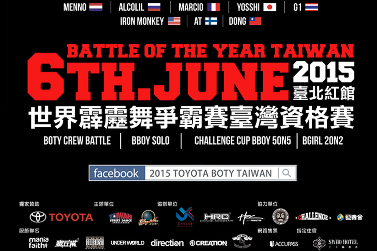 賭上舞者一生的榮耀。為鼓勵年輕族群從事正常休閒活動,並提供表演舞台讓年輕人展現活力與創意,2015年TOYOTA展開BOTY世界霹靂舞臺灣資格賽冠名贊助計畫,透過深耕新世代舞蹈活動,傳達TOYOTA品牌年輕活力的精神,更重要的是提供與國際表演接軌的機會,讓台灣在國際大型舞蹈賽事取得更高的能見度。