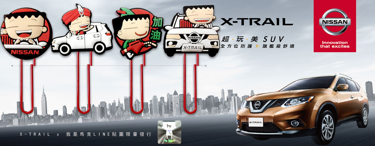 裕隆日產追求跨界與超越的腳步不停歇,除「裡外兼good」三大優惠方案外,裕隆日產更提供由X-TRAIL與知名插畫部落客馬克跨界合作設計的限量「X-TRAIL x我是馬克」迴紋針組。2015年5月30日起至6月30日止,消費者至NISSAN展示中心試乘,有機會免費獲得一份限量「X-TRAIL x我是馬克」迴紋針組,數量有限,送完為止。歡迎喜愛NISSAN的消費者前往全國展示中心,感受NISSAN車系的安心、舒適、節能等優質產品力。