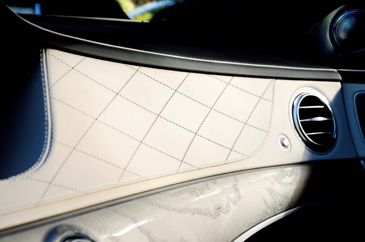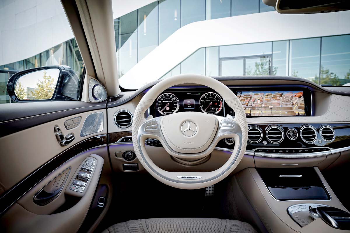 坐進車內,格局雖依舊是大家熟悉的S-Class,將儀錶板及Comand介面整合在21吋液晶螢幕之內的設計都沒變,但全面翻新的色系搭配與材質運用,如菱格紋車縫線的米色皮革中控檯,還有特殊的淺灰色木紋內飾板,加上細膩的觸感與精緻組裝,對視覺與觸感來說都是至高的享受。獨特的雙幅方向盤雖然跟印象中的AMG跑格有些衝突,但使用Nappa皮革包覆而提供紮實握感,外加操作精準的鋁質換檔撥片,這些都讓我對S65 AMG的好感持續加溫。