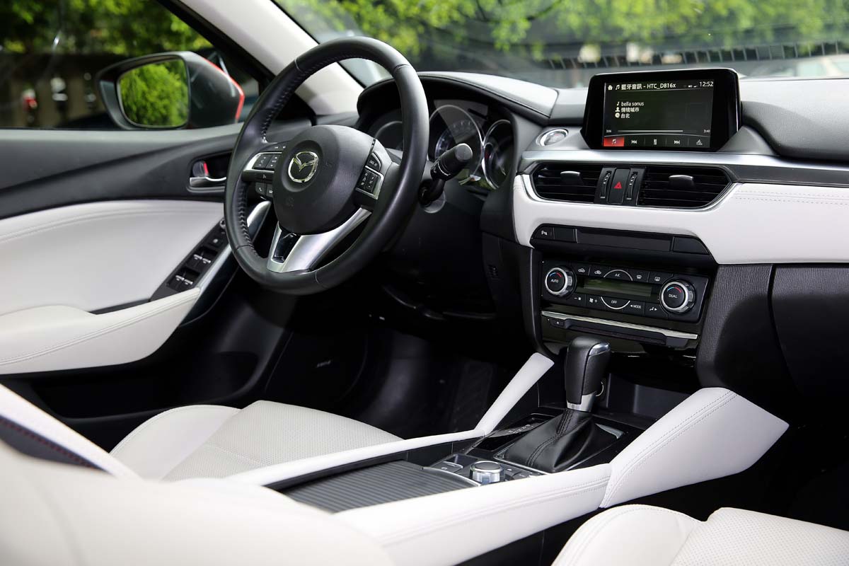 雖然3代目Mazda 6推出至今也有一段時間,直到這次的小改款筆者才有榮幸可親臨她一番,這次台灣馬自達提供了Skyactiv-D的最頂級車型,因此才會有白色皮革來增添內裝質感,踏進車室內,全新設計的中控台到中央扶手的部分看起來更具有運動感,中控台上除了銀色的髮絲紋外,在與真皮編織的白色皮革搭配之後,格調也大幅提升許多,雖然車輛設定並非純運動取向,不過原廠電動座椅提供了腿部及腰部相當好的支撐,當天約將近400km的試駕筆者沒有感到任何的不適,中控台上的液晶螢幕操作便利程度令人感到滿意,不需要複雜設定,第一次上車就能夠上手,音響則也能與手機藍芽配對方便許多。