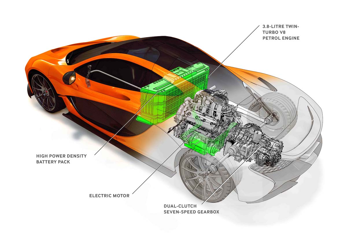 | McLaren P1採用3.8升V8雙渦輪增壓引擎,可輸出737hp/73.4kgm,再搭配可輸出179hp/26.5kgm的後軸電動馬達,使P1能夠爆發出916hp最大馬力以及91.8kgm最大扭力,0~100 km/h2.8秒、0~200 km/h少於6.8秒,且0~300公里也只需16.5秒,極速350km/h。 |