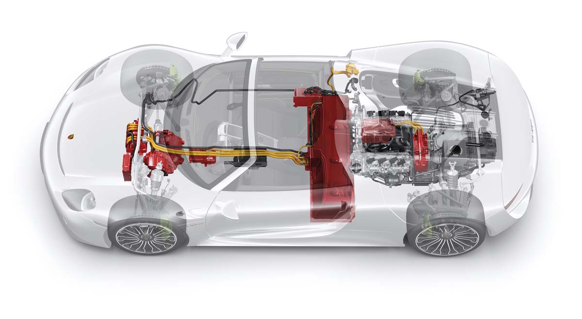 | Porsche 918 Spyder引擎部份為一具可輸出608 hp最大馬力的4.6升V8引擎,前、後軸上則各別配置一具電動馬達作為輔助,分別可提供127hp與54hp的性能,進而讓整車綜效馬力達到了887hp,僅需2.8秒就可完成靜止加速到時速100km/h的短跑,極速上看342km/h。 |