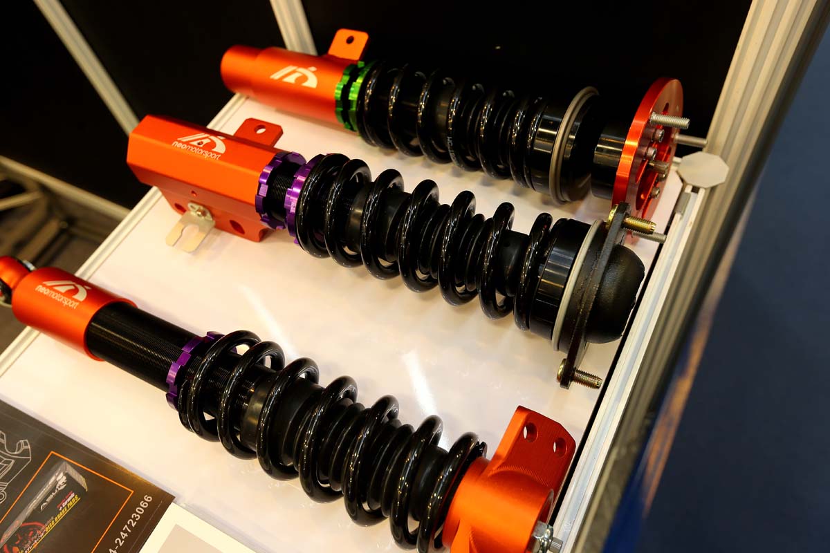 國內其實有許多廠商是相當有水準的,銀泰旗下的Neo Motorsport懸吊就是一個例子,複合式雙筒身設計擁有更好的Q度,並且大量在美國提供嚴苛的甩尾賽事使用,鋁合金底座及魚眼上座都有塗上專屬的橘色色澤,而如果不需要那麼競技的車主也可選擇強化橡膠上座即可,而這次展覽中全新推出的ASUKI陶瓷來令片,更可直接對應至700~800度的工作溫度。