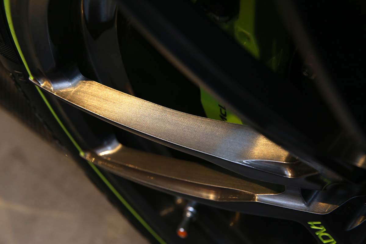 也因為如此特殊的服務獲得不少超跑及冷門車的喜愛,這輛黑色塗裝的MP4 VX就是其中之一,這輛車選擇上了ADV5.2 MV1的CS版本,CS版本簡單來說就是競技輕量化版本,屬於ADV.1輪圈中最頂級的規格,規格部分維持MP4原廠前19吋/後20吋的設定,前8.5J+34的規格約0.3mm的距離剛好閃過Mclaren原廠6活塞卡鉗,後11J+34更是能夠容納原廠就寬達305mm的巨胎,ADV5.2 MV1主要以5爪為概念,並且每隻Spoke皆再分成2爪,而CS版本則是會再施以大幅度的輕量化,這個可從每根爪子上就能看見CNC的車削,而綠色的字體及外延都是車主客製化所要求,並且前輪可控制在8.5公斤,而20吋的後輪更是只有9.2公斤,而色漆上更是採用今年相當夯的糖果漆,半透明的呈現方式更是可一舉透視到鍛造鋁合金切削面的特殊紋路,此外這輛車也換裝了全車的Vorsteiner碳纖維空力套件,及AK全段的排氣系統,與ADV.1搭配下空氣中莫名流露出一股嚴肅的味道。