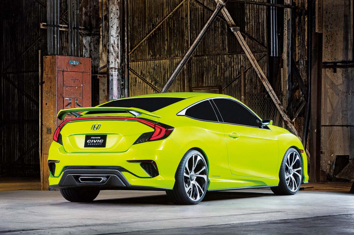 紐約車展上的Civic雙門跑房概念車仍是目前為止最具參考價值的實體,基本上要面對Mazda 3、Focus和Elantra這些同級車,Civic要能夠一改逐顯老態的產品賣相就是要有更有運動味。即便不是正港鋼砲,卻有著高性能車的設計,這樣的指標在Civic概念車上發揮得比過去還要徹底,引擎蓋上有著兩側較為高聳的造型,水箱罩的Flying H結構基本上看起來很像九代歐規的基本輪廓,但不同材質的搭配讓整個車頭更加精緻,保桿也加入了更大的進氣壩並導入LED光條;車尾多少保留了過去Civic掀背高聳壯碩的基因,有頗接近CR-Z的風貌,大型環狀LED尾燈則多少仿效自之前Civic Type R概念車時期,配合尾燈造型而打造的尾翼也增加了不少性能味。