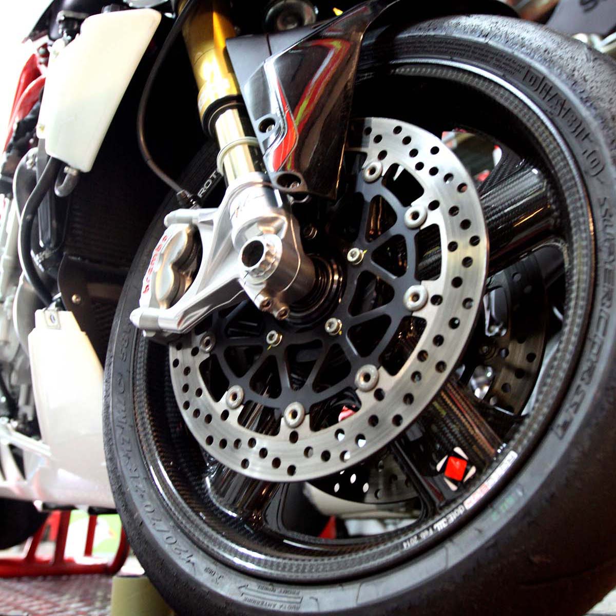 ROTOBOX碳纖維輪框有多輕?原廠輪圈為了大量生產基本上都採用鑄造材質較多,大多數17吋後輪的重量就約6kg左右,而ROTOBOX 1199 Panigale專用碳纖維輪框,前2.72kg/後3.14kg總合起來也不過5.86kg,幾乎不到原廠一個後框的重量,有多輕就不用再多做介紹了吧。