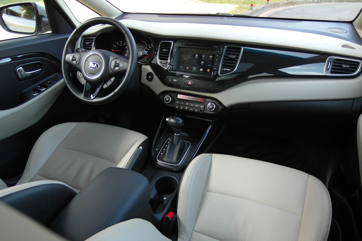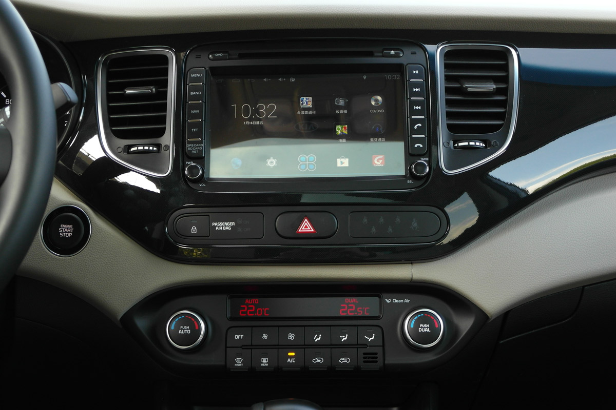 尤其內裝採雙色設計,塑件材質相當細緻,涵蓋仿皮質觸感中控台飾以鍍鉻或仿鋁合金處理,網格紋亮面飾板更屬國產車級距上乘質感。頂級版7人座客車搭載8吋多媒體觸控音響,有如平板電腦行動裝置般內Android的操作系統,提供包括衛星導航、音響、藍芽通話、DVD/CD功能,且可擴充App,讓Carens行車功能完備且精采。