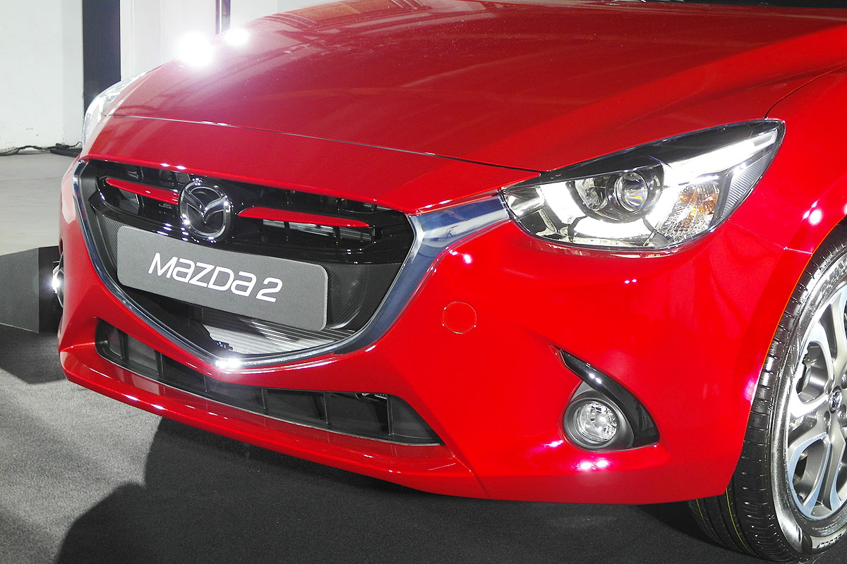 2016年式All-new Mazda2,以獵豹衝刺前行的躍動姿態做為車身設計的基礎輪廓,前伸的水箱罩銳角,詮釋獵豹狩獵前蟄伏姿態的侵略感。透過前輪前移80mm、A柱後移80mm的比例調整,展現猶如GT跑車般的動感身形。大面積的水箱罩引領車身前進,下方往兩側上揚後掠的魂動之翼,與頭燈連成一氣,刻畫出更大膽且進取的輪廓。兩側頭燈造型讓野獸靈性呼之欲出,以首度整合投射式科技與LED技術的設計,展現炯炯有神的銳利目光緊盯前方。