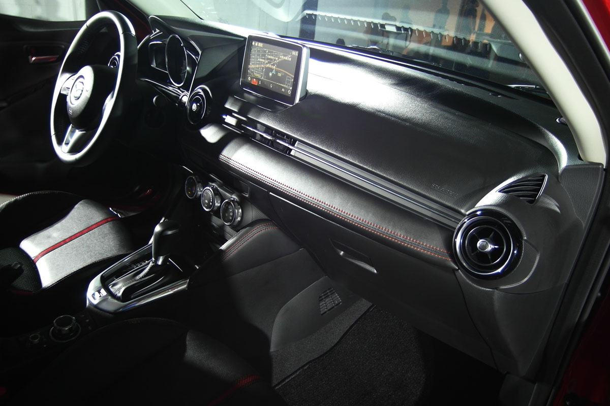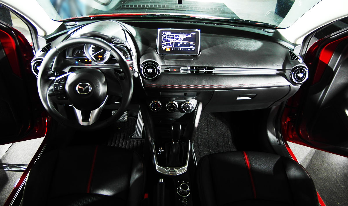 以獵豹躍起的肌肉線條作為外觀造型的設計主軸,All-new Mazda2更以噴射戰機作為座艙的貫穿主題。飛翼式儀表造型展現如機翼展開的霸氣,空調出風口呈現如噴射引擎的經典魅力,放射線門板線條,則模擬出如噴射引擎運轉時噴發的氣流。讓駕駛乘坐其中,可擁有如翱翔天際的自在與快意。