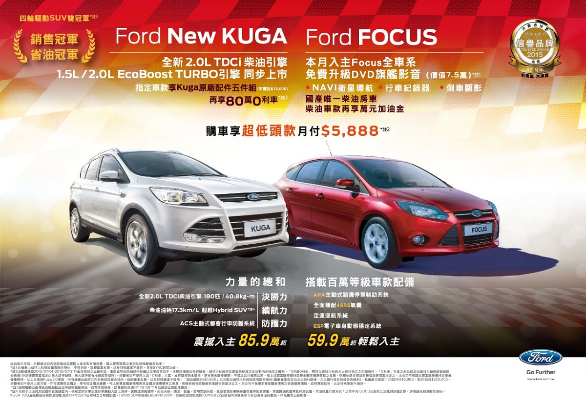 福特致力於提供消費者超值配備,本月多項配件升級好禮方案,包括入主Ford Focus全車系,即可免費升級市價新台幣75,000元的DVD影音旗艦版,功能提供NAVI衛星導航、行車紀錄器與倒車攝影。入主柴油動力Ford Focus更享萬元加油金。購買Ford Kuga指定車款,即可獲贈價值近新台幣15,000元原廠配件五件組,並享有80萬零利率優惠(適用於Kuga 2.0L 全車型和1.5L 時尚經典型)。入主Ford EcoSport都會時尚型,即免費贈送新台幣價值7,900元原廠豪華後備胎蓋。