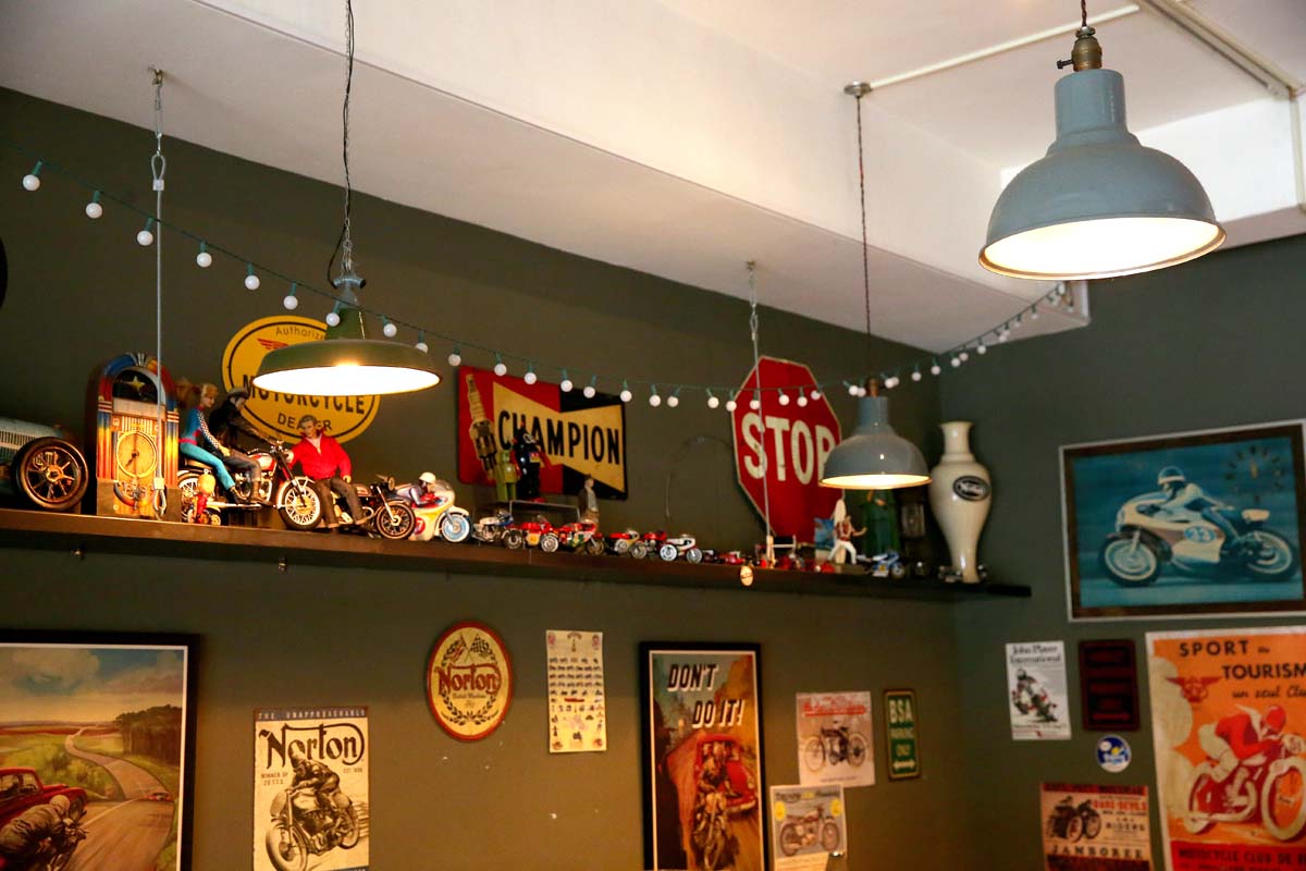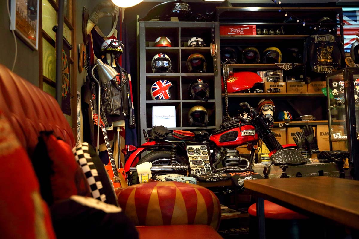 而因為長時間受到英式文化的薰陶,加上自己本身就是設計科班出身,所以比一般人更能將想法實踐到現實世界,所以回台後不久就開始策畫將英式Cafe Racer文化由自己傳達給台灣車界,因此花了將近1年的時間開始尋找店面及整備需要鋪陳的裝飾品。目前店內可以看到的如點唱機、桌椅、電風扇到大門跟門把通通都是小宗一手包辦,走進室內就可發現光是燈泡的色溫就散發出濃厚的1960年代味道,所有的裝飾與陳列方式都彷彿是置身在老電影才會出現的畫面內,也因為愛車是英國凱旋的關係,凱旋的車友也都時常來店內聚會,看著小宗的Cafe Racer的打扮,許多車友也都從全罩開始變成3/4帽,到現在的復古手工半罩帽,皮衣也從厚重的Race風格開始改變,Ton Up Cafe內也有小宗由英國導入的Davida手工帽等皮件等,就連想要油頭當個英國帥哥也都能在Ton Up Cafe店內購得專用髮油。