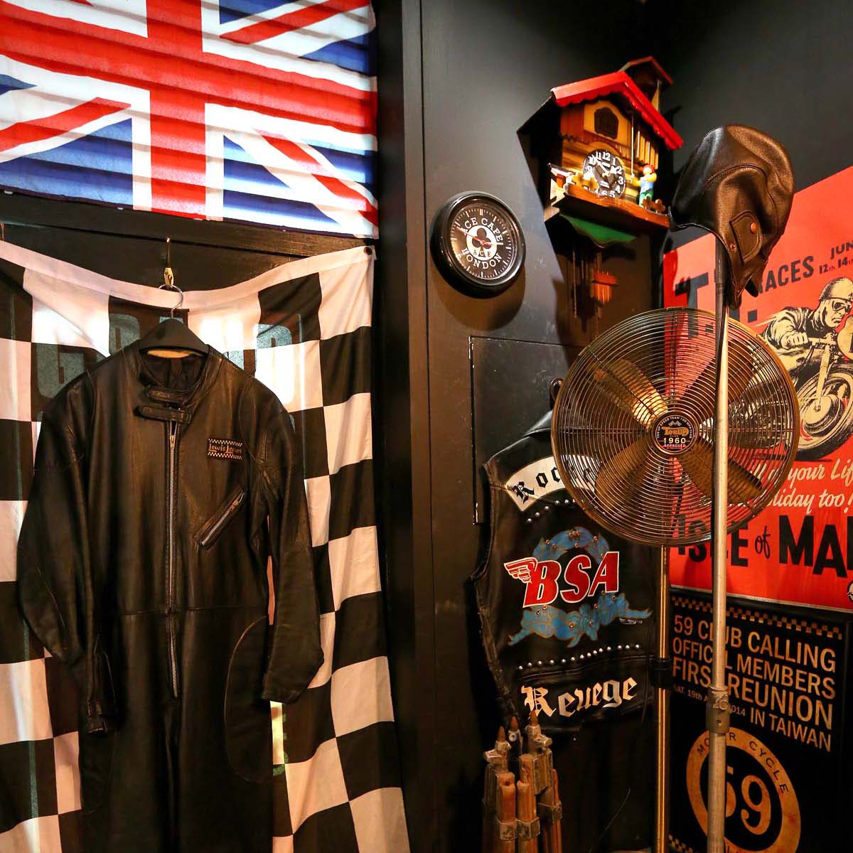 小宗表示Cafe Racer的服裝其實在50~60年代二次大戰後裔所傳承下來的,大戰結束後父親參加戰役所留下的外套、帽子到圍巾,因為相當帥氣,這些遺留下的後裔就穿著它們騎乘機車出來,如果沒有帶帽子那當然就要梳個油頭來電昏路邊的女孩,也就是這樣Cafe Racer在人的造型上也就這樣流行了起來,不過因當時除了Cafe Racer外,偉士牌的出現也在英國掀起了所謂MODS(Modernism or sometimes Modism)雅皮風,西裝筆挺加上長版的軍外套就是MODS風格,車輛部分更是要在車頭前加裝很多汽車的霧燈,也因此偉士牌才又有孔雀之名,當然新的文化竄起最容易發生的就是互看不順眼,因此兩派人馬在1964年就在當時的Ace Cafe互幹了起來,就此開始英國政府在1970年強制Ace Cafe歇業,直到1990年時Ace Cafe才又復活直到現在仍在營業中。
